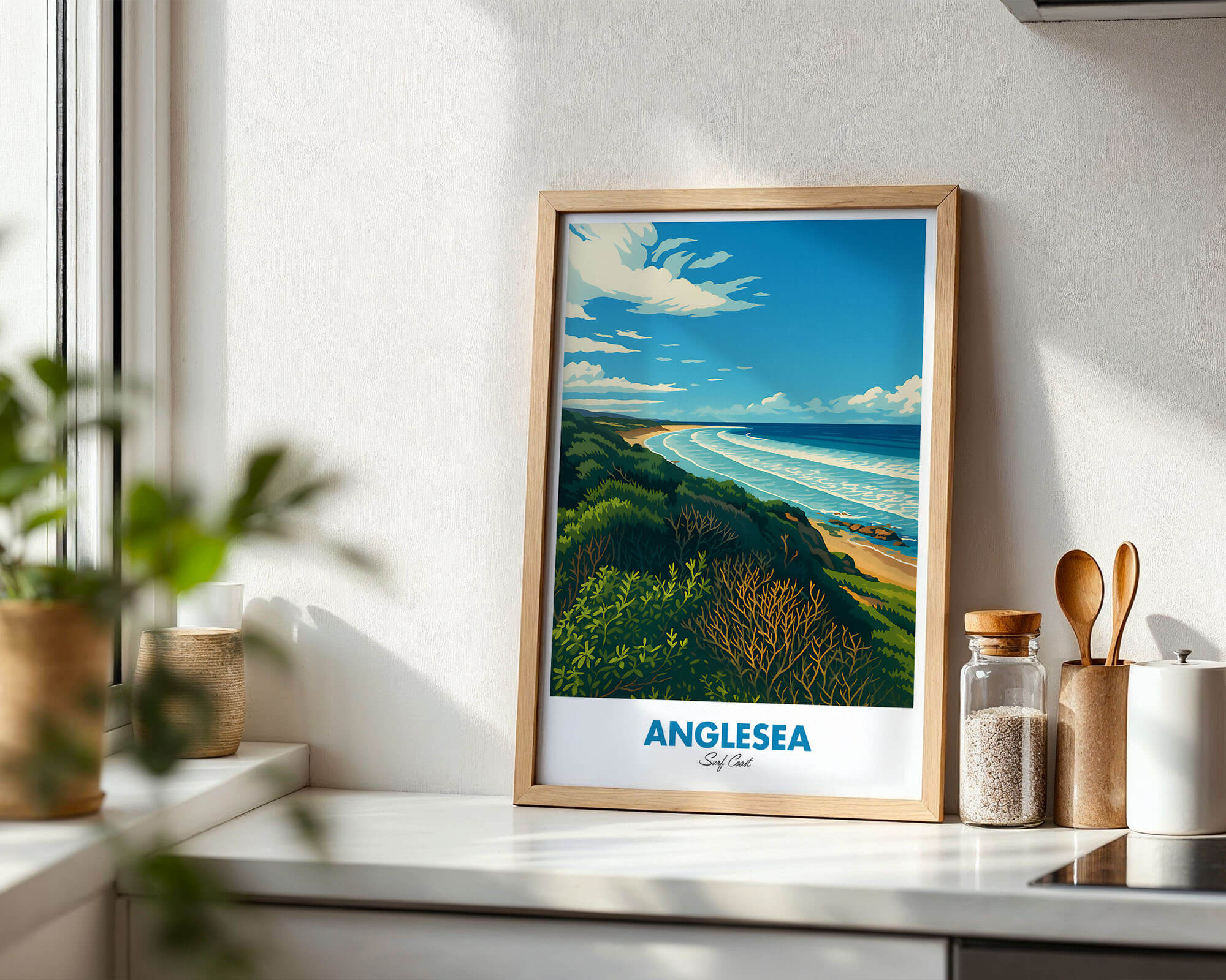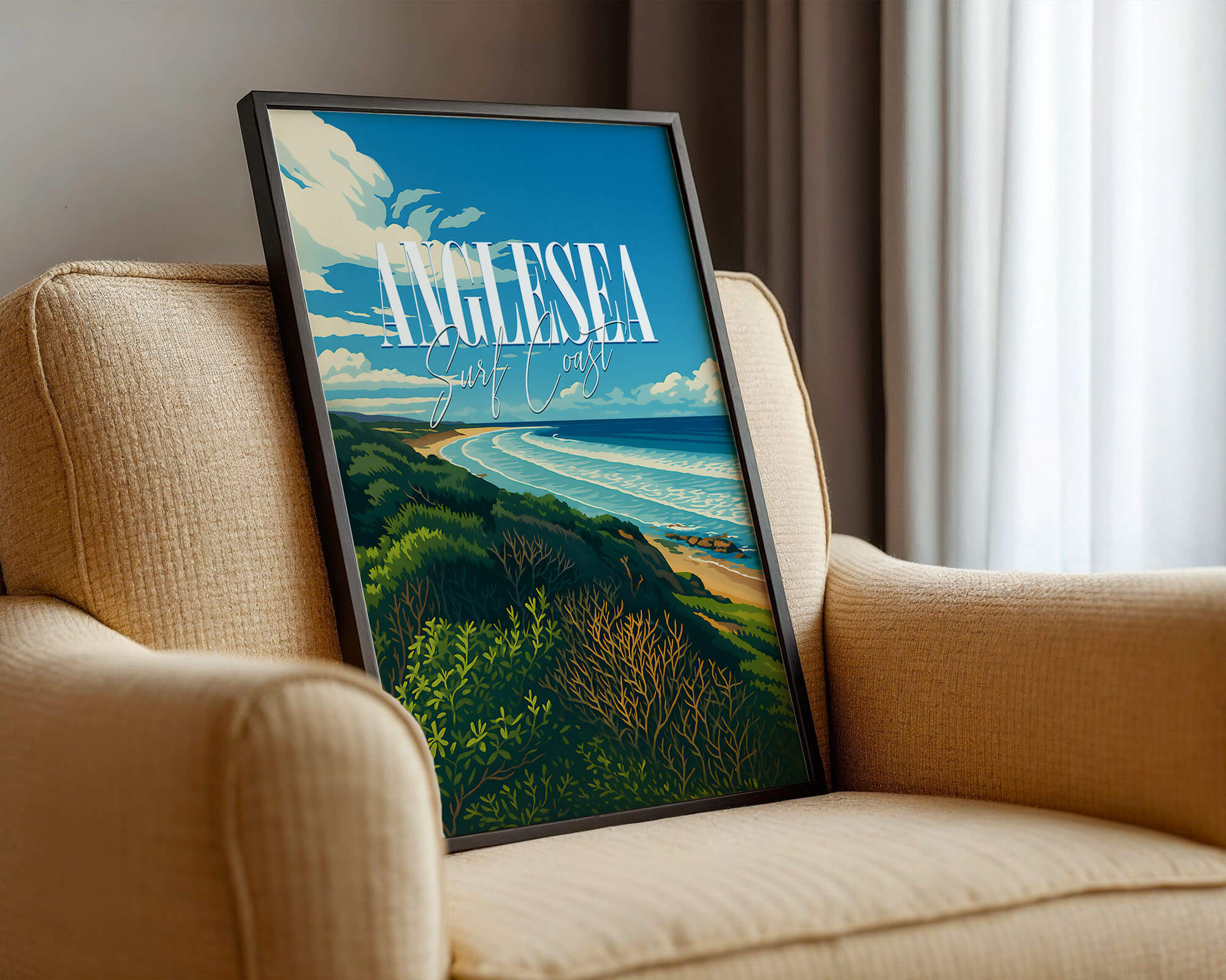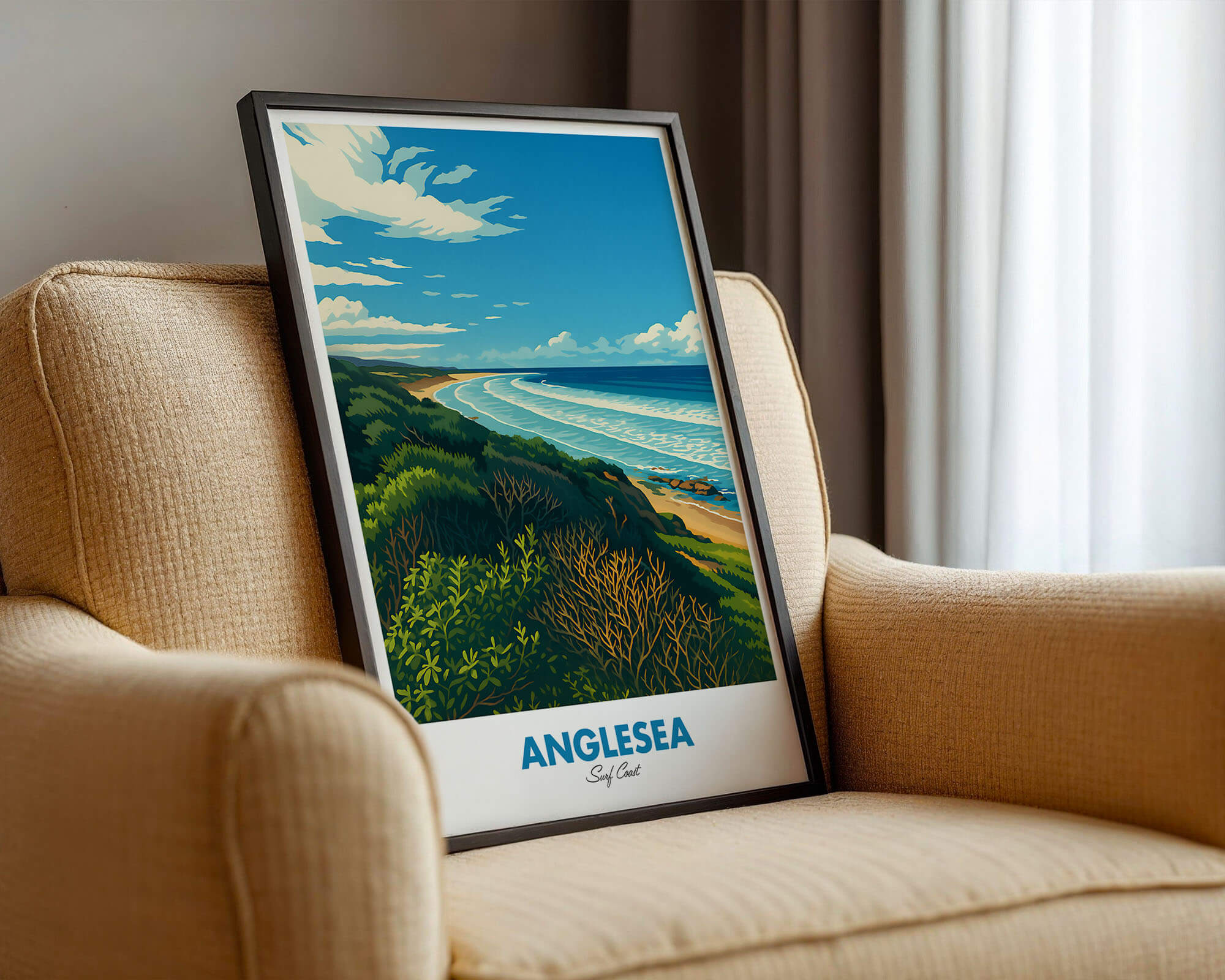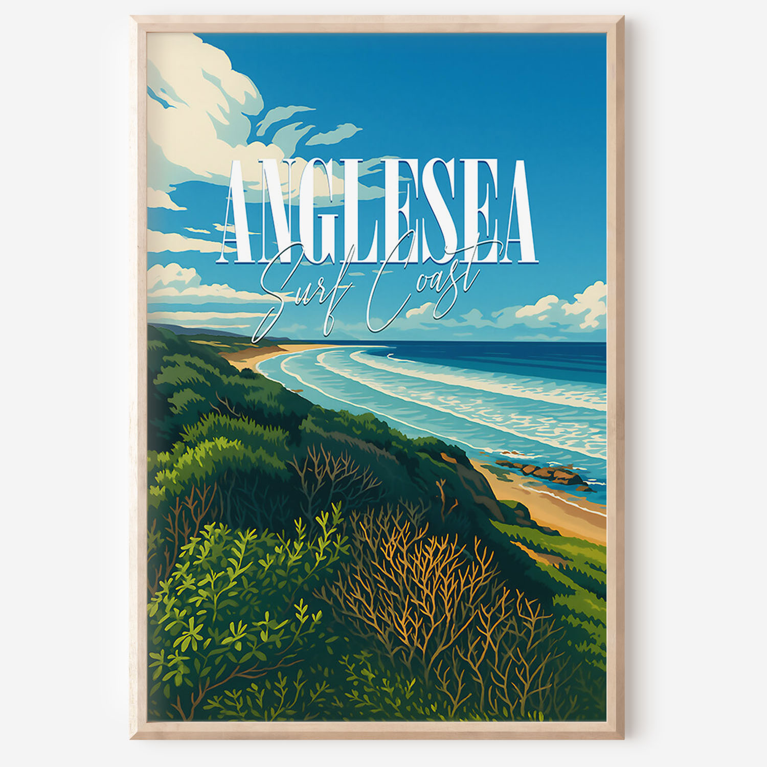 This Anglesea travel poster celebrates the river mouth, coastal heath and sweeping bay of one of the Surf Coast’s favorite towns. The retro illustration style adds warmth and personality while remaining clean and modern. Printed on museum-grade matte art paper with archival pigment inks for excellent longevity. A fresh update for living rooms, hallways or holiday rentals. Designed locally and printed in Australia, available from A4 to A0.