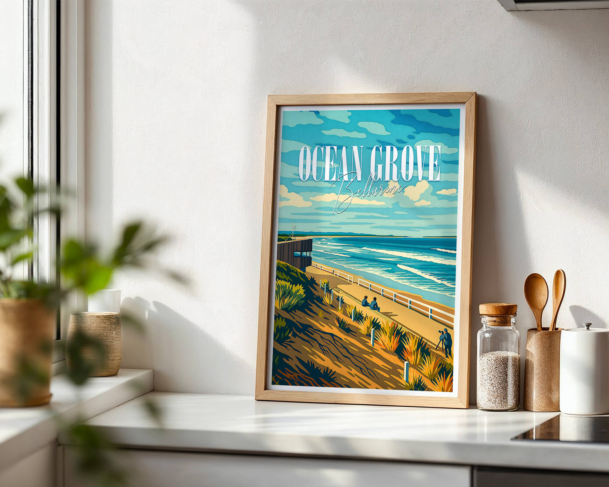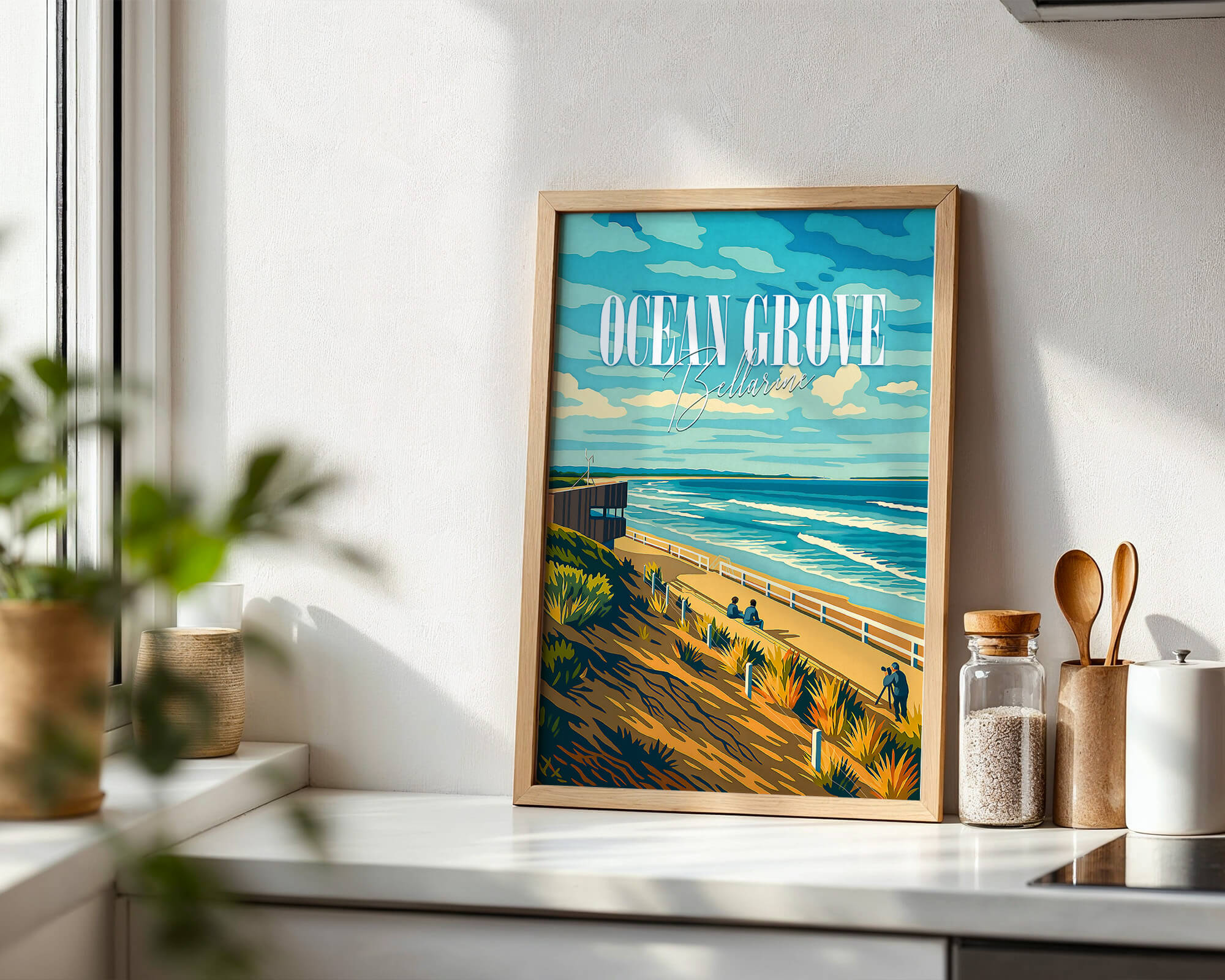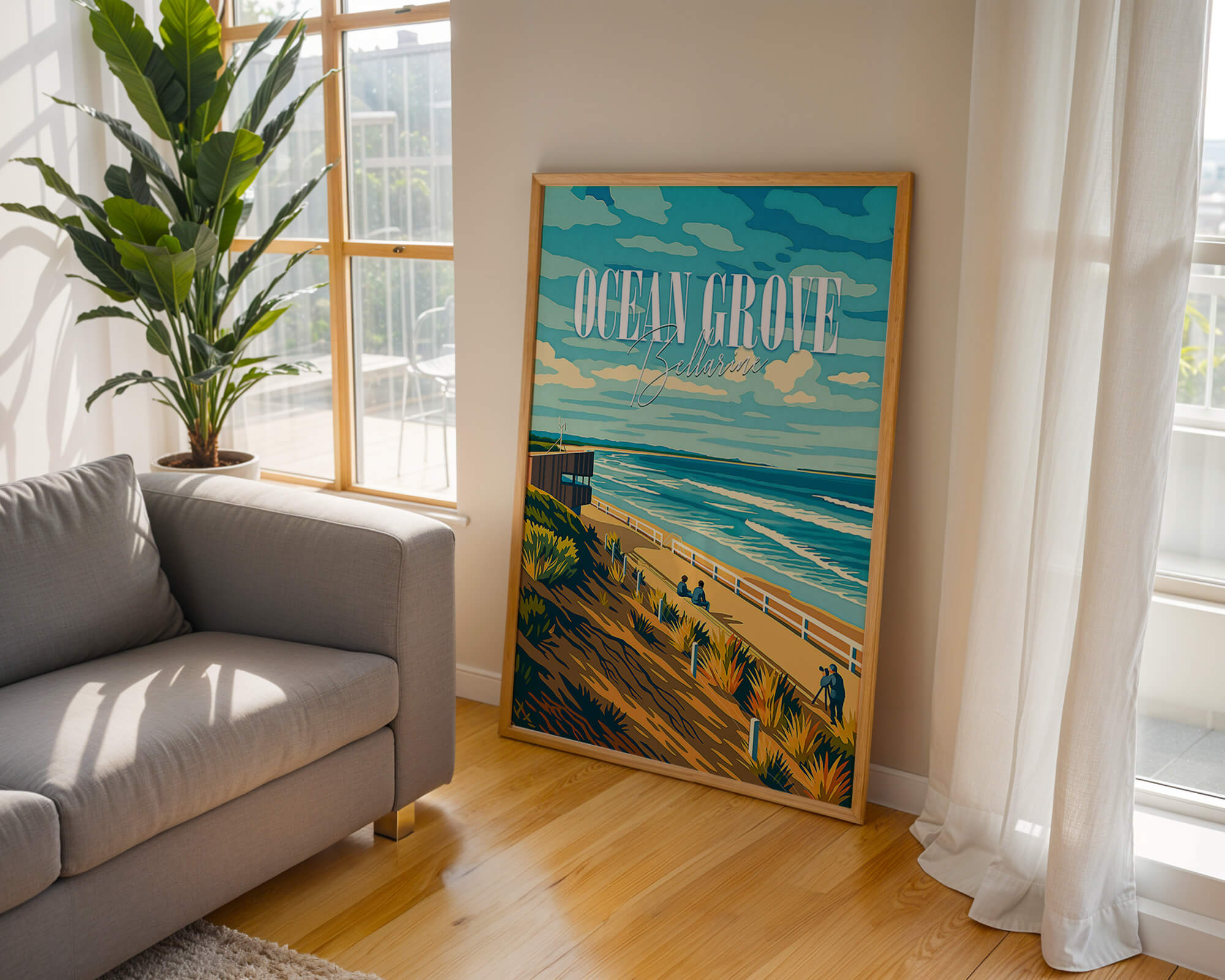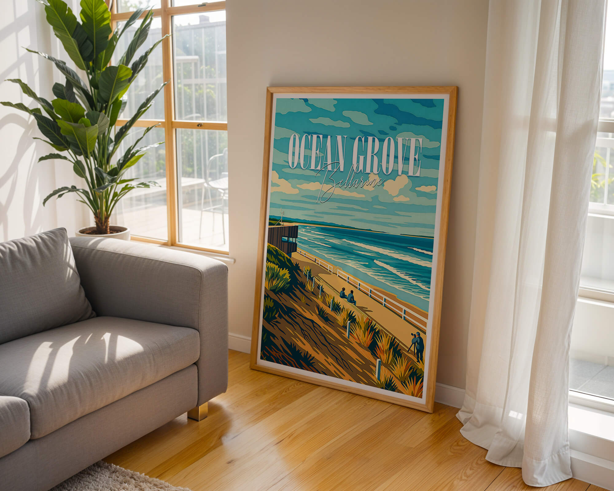 Ocean Grove’s wide beach, dune tracks and open skies are captured in a bright retro travel illustration. Printed on 250 gsm archival matte paper with pigment inks for clarity and longevity. It is an easy, coastal piece that fits living rooms, entries or holiday houses. Designed on the Bellarine and printed in Australia. Available from A4 to A0 to suit any wall.