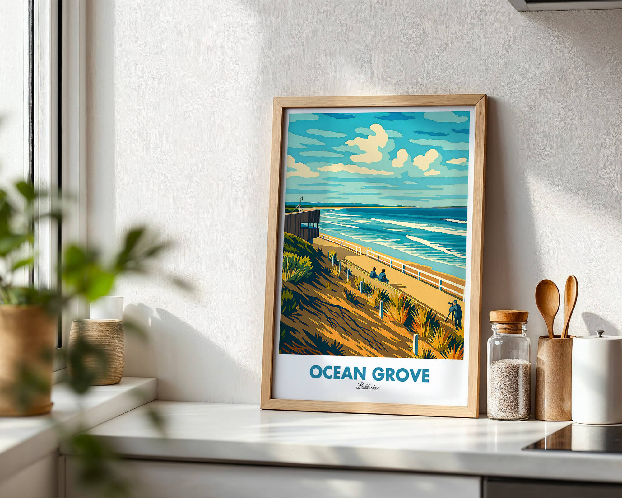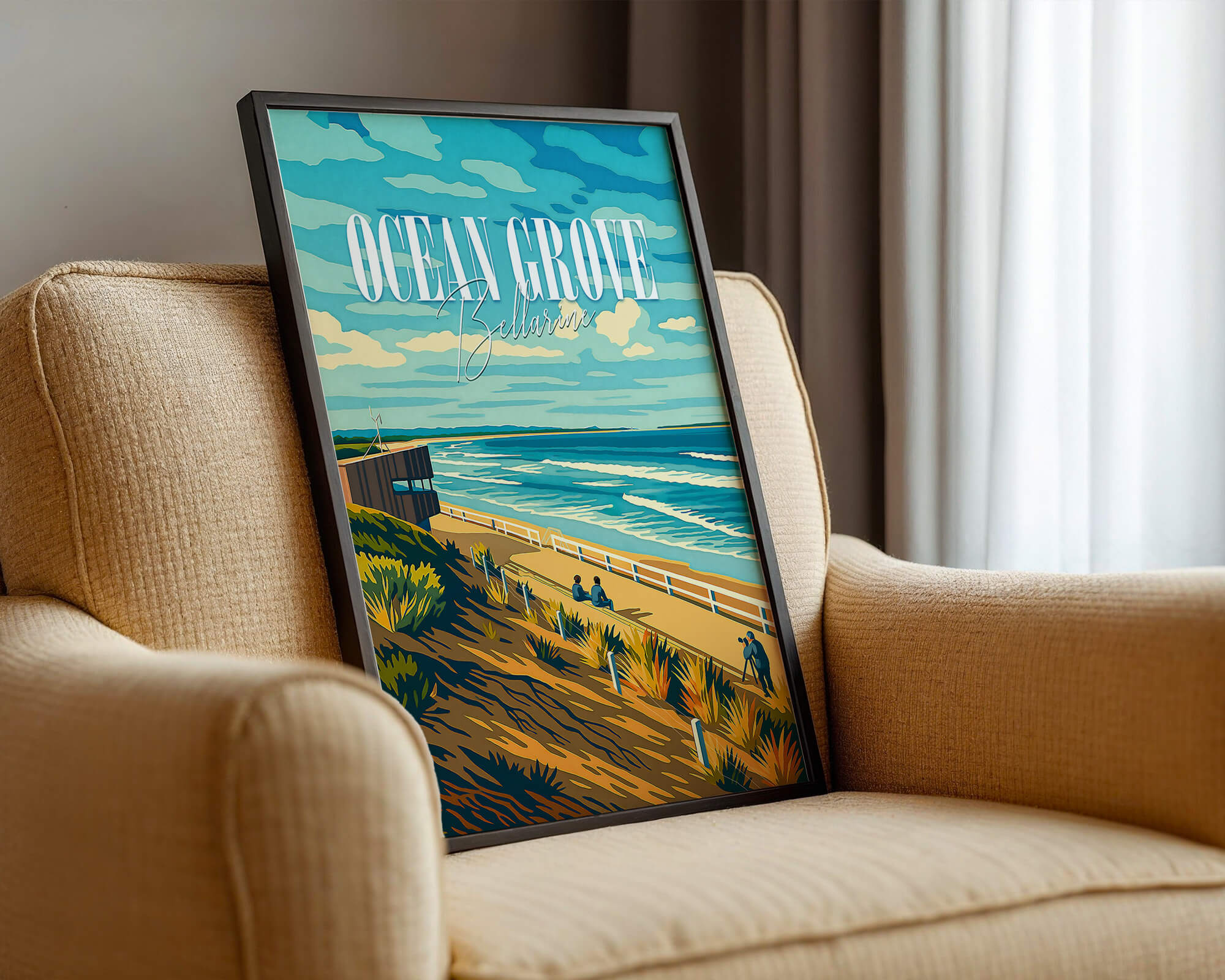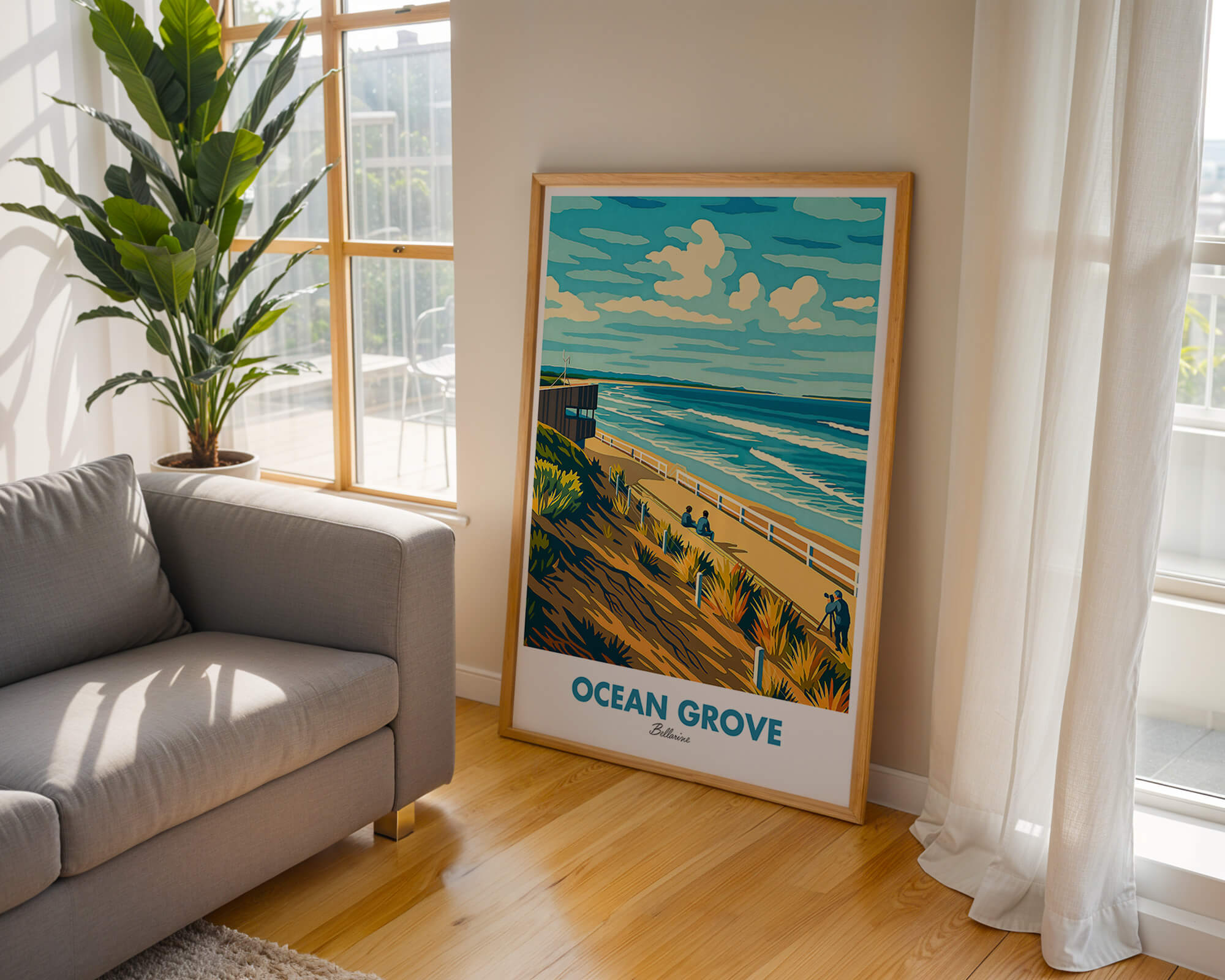 Ocean Grove’s wide beach, dune tracks and open skies are captured in a bright retro travel illustration. Printed on 250 gsm archival matte paper with pigment inks for clarity and longevity. It is an easy, coastal piece that fits living rooms, entries or holiday houses. Designed on the Bellarine and printed in Australia. Available from A4 to A0 to suit any wall.