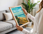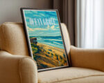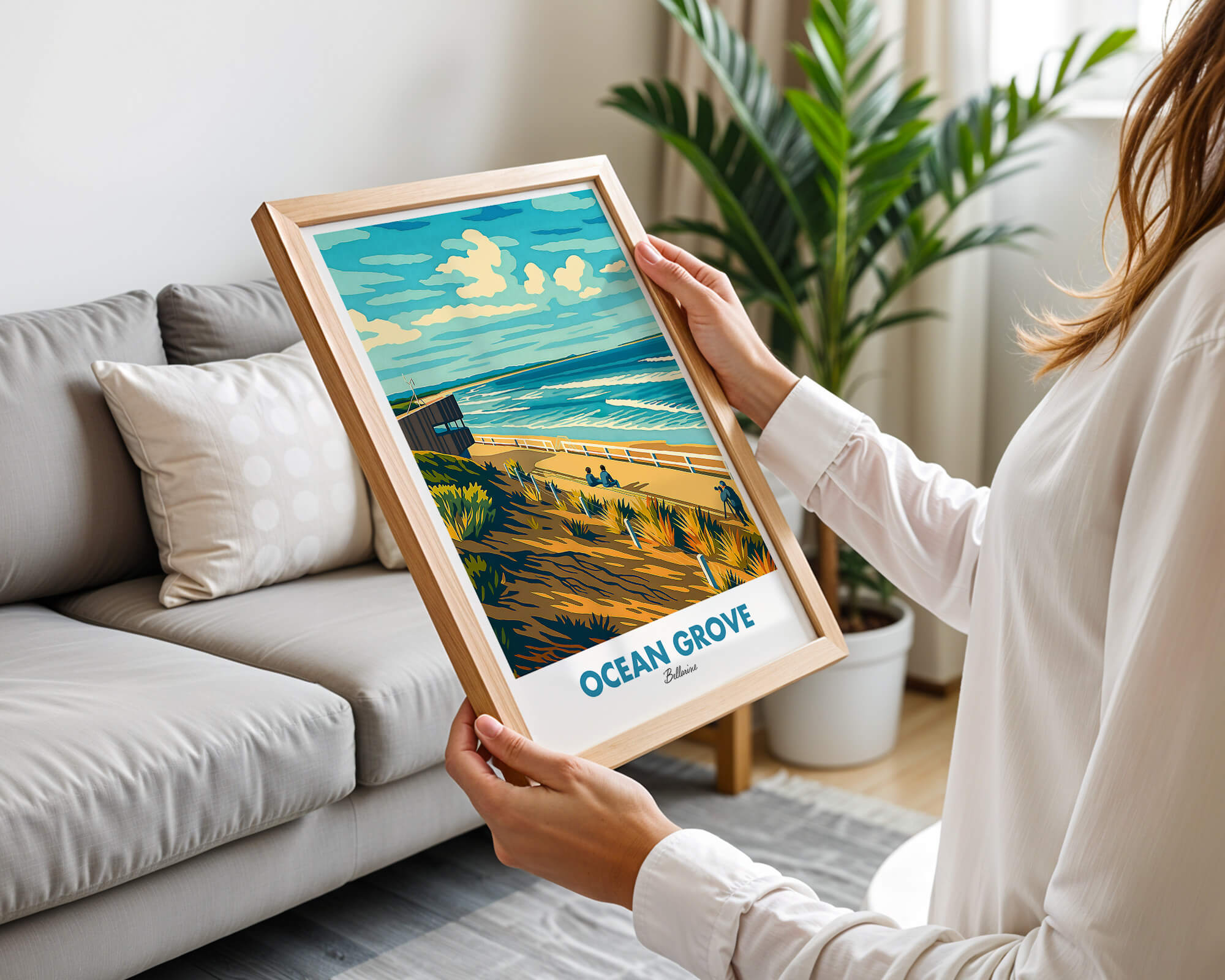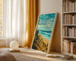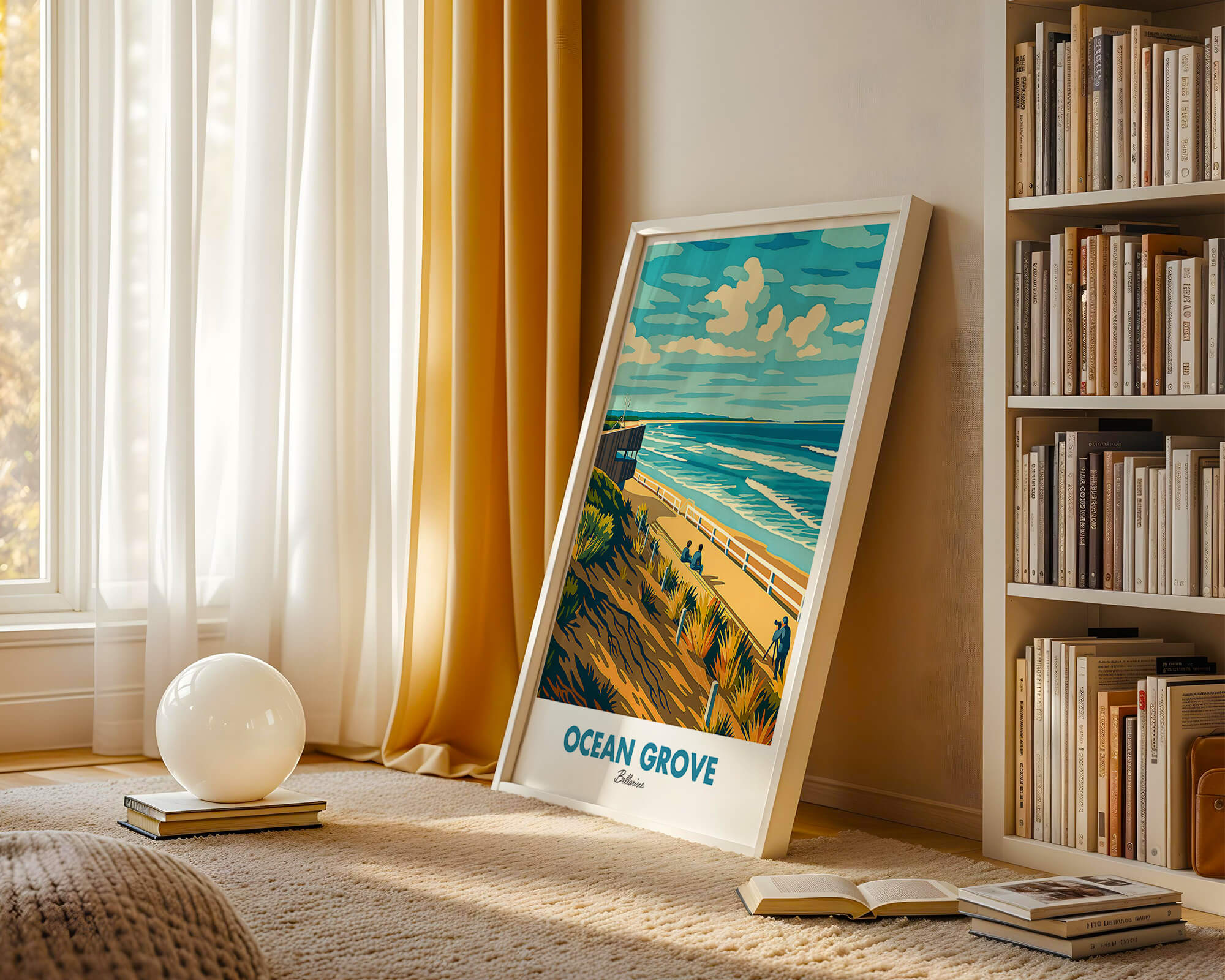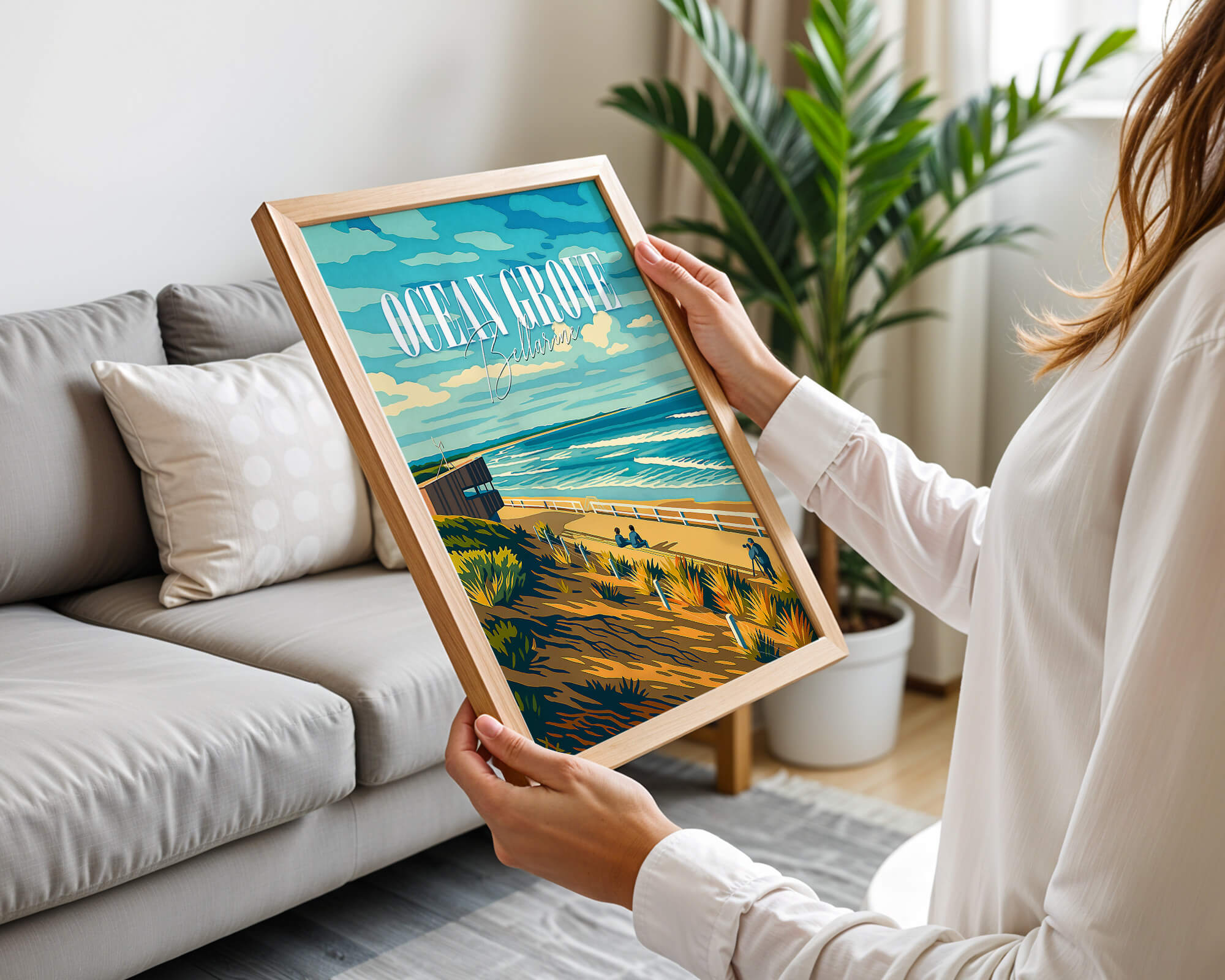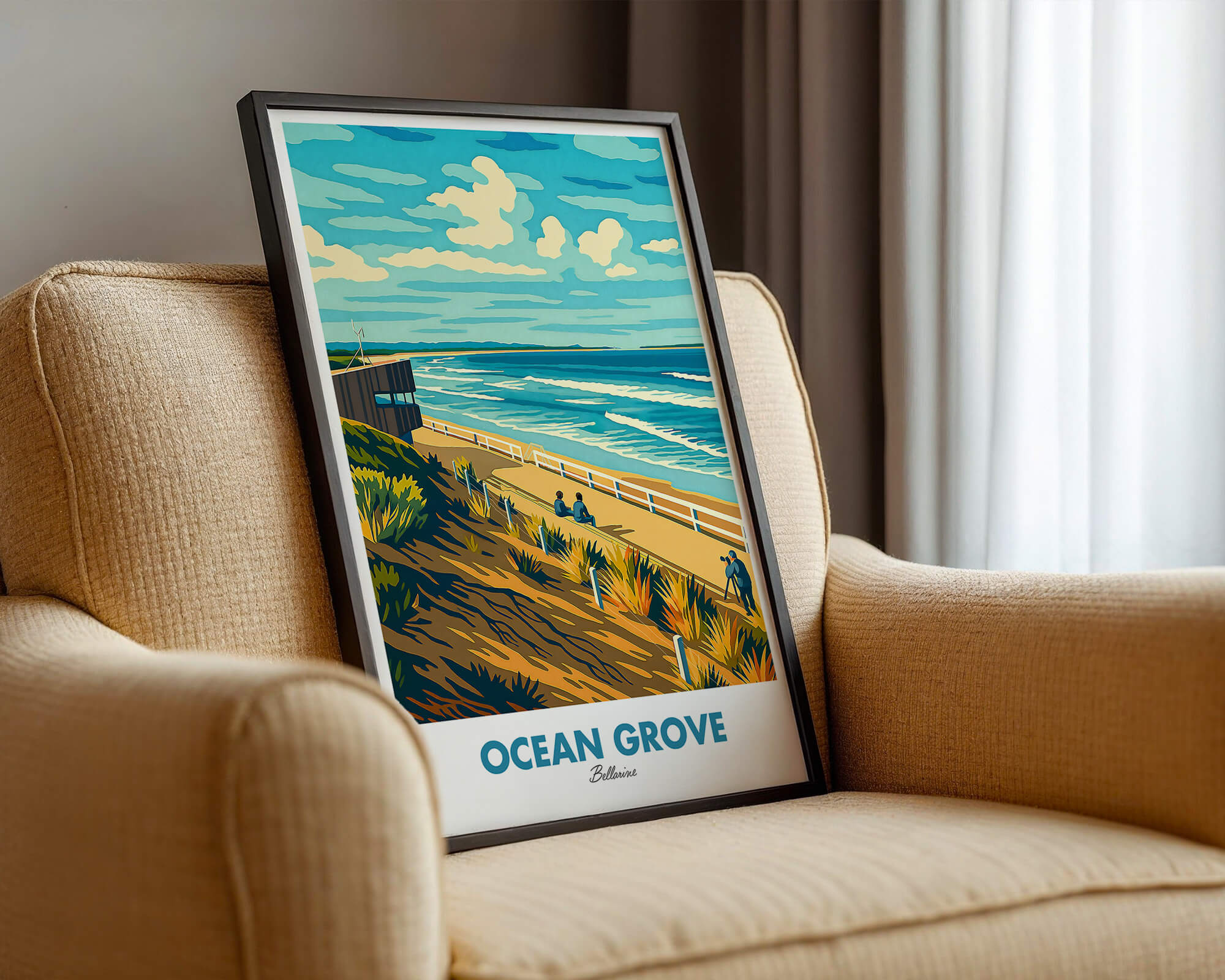 Ocean Grove’s wide beach, dune tracks and open skies are captured in a bright retro travel illustration. Printed on 250 gsm archival matte paper with pigment inks for clarity and longevity. It is an easy, coastal piece that fits living rooms, entries or holiday houses. Designed on the Bellarine and printed in Australia. Available from A4 to A0 to suit any wall.