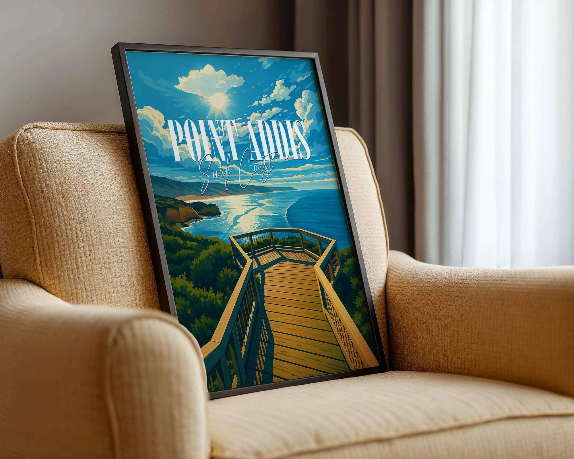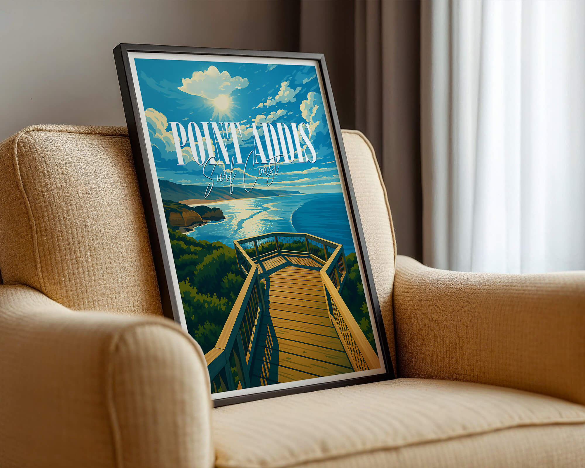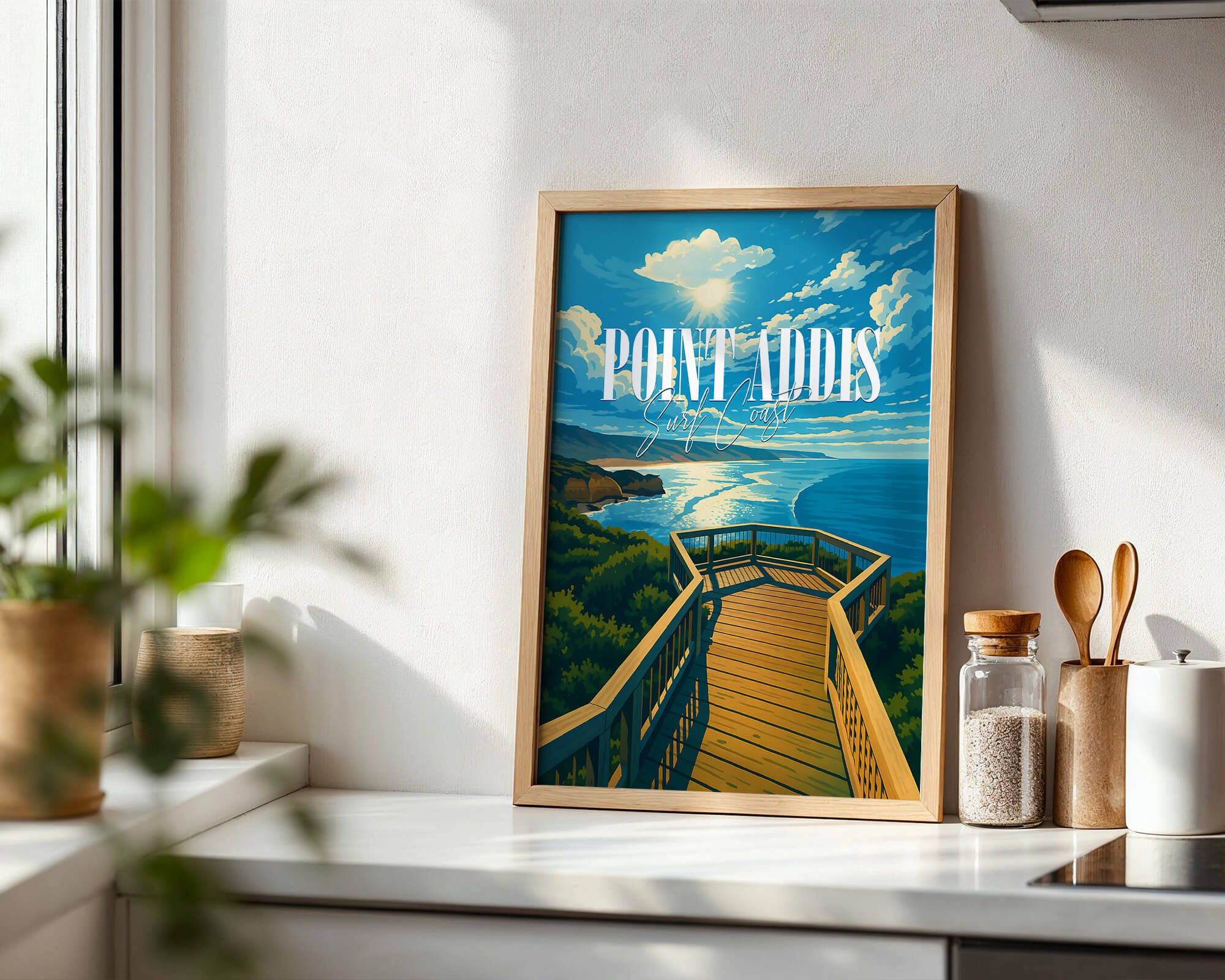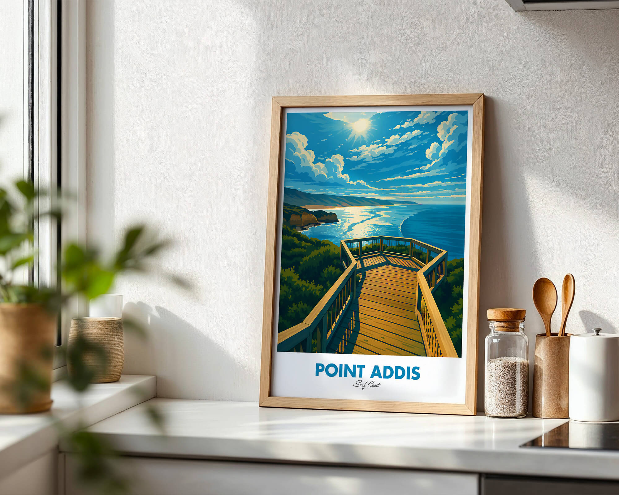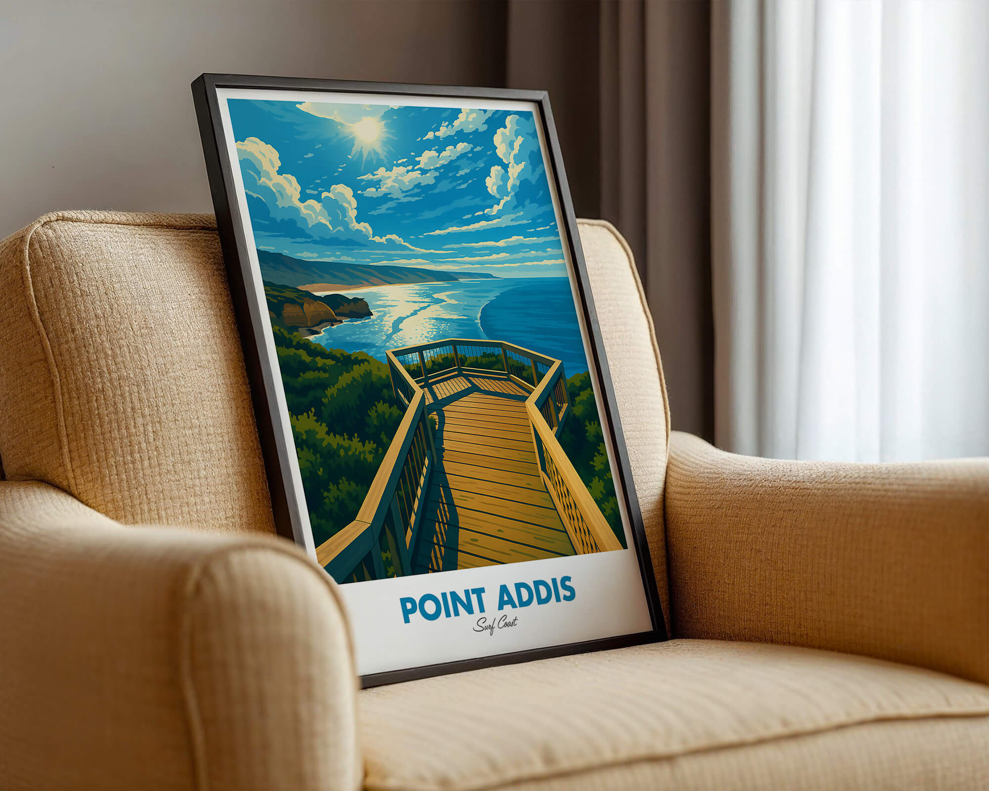 Our Point Addis poster showcases dramatic limestone cliffs, tea-tree scrub and the deep blue of Bass Strait. Illustrated in a classic travel poster style, it brings warm coastal light and natural texture to any space. Printed on 250 gsm archival matte paper using pigment inks for long-lasting color. Ideal wall art for coastal homes, Airbnb decor or gifts for Surf Coast lovers. Designed locally and printed in Australia. Sizes A4 to A0.