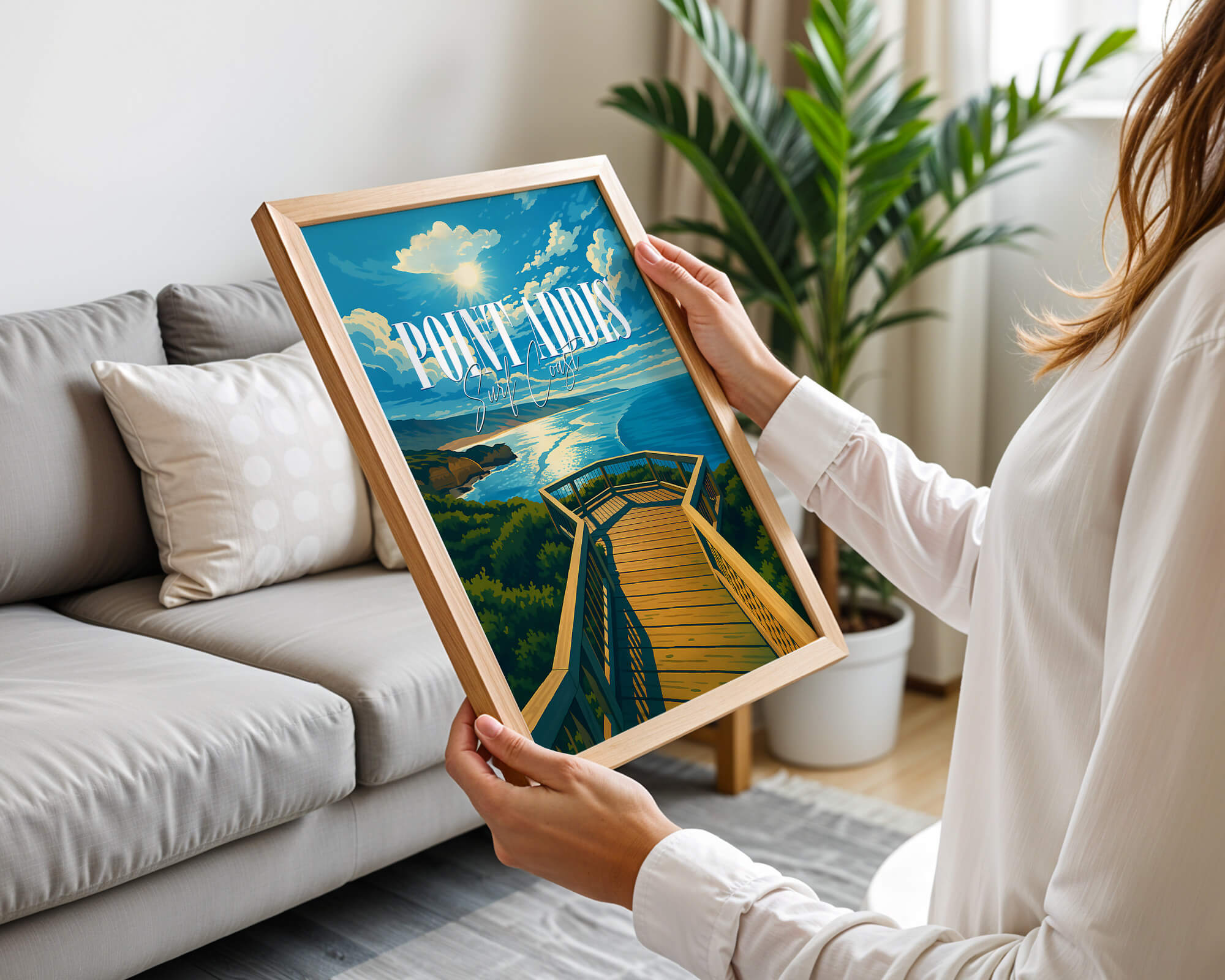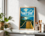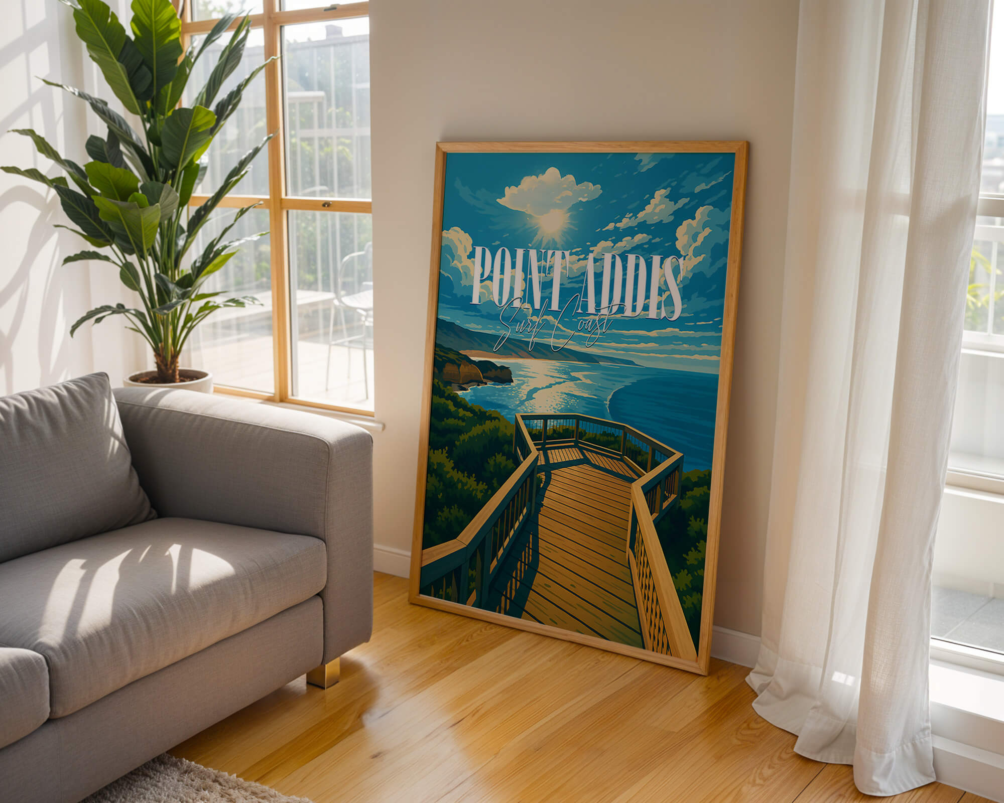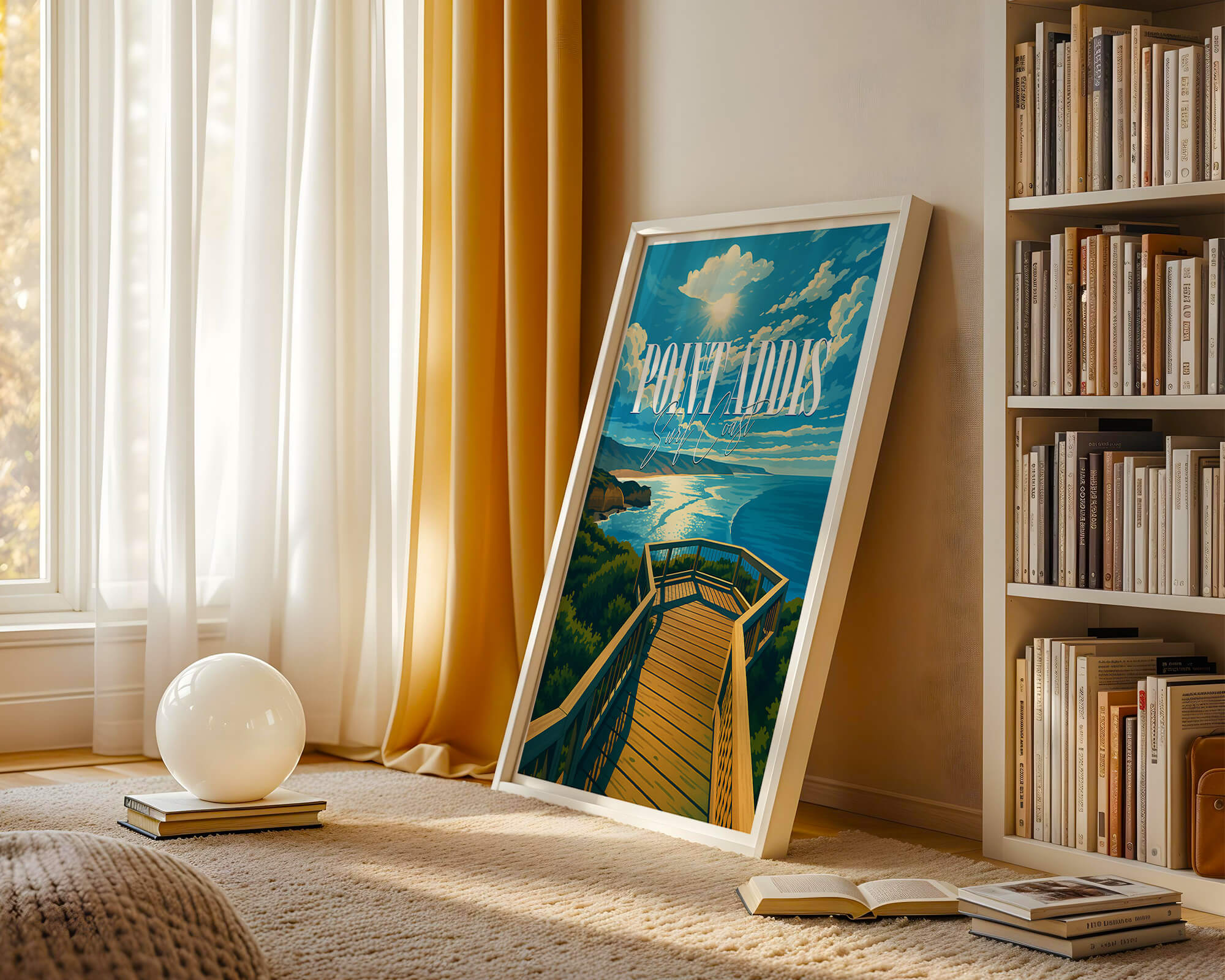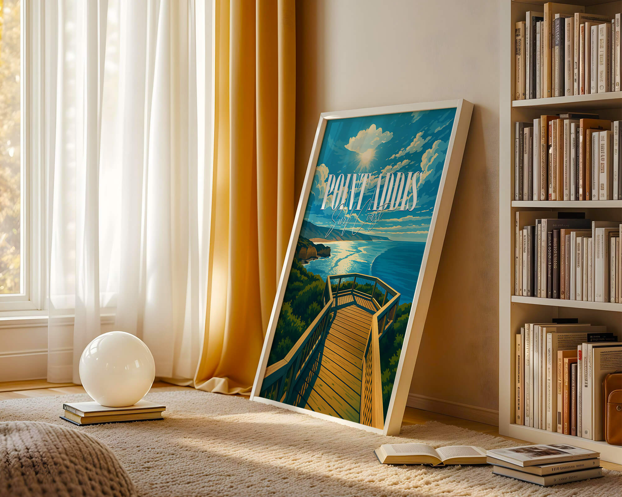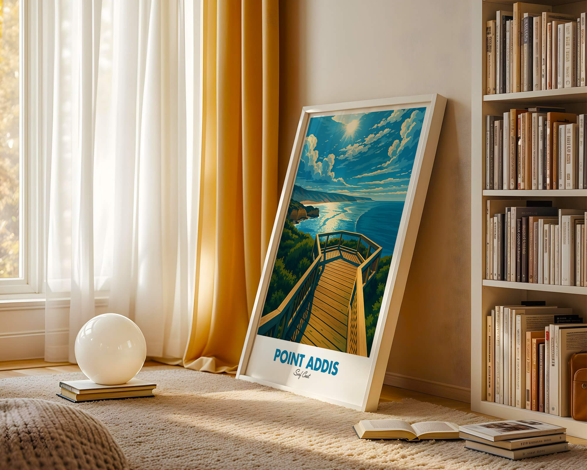 Our Point Addis poster showcases dramatic limestone cliffs, tea-tree scrub and the deep blue of Bass Strait. Illustrated in a classic travel poster style, it brings warm coastal light and natural texture to any space. Printed on 250 gsm archival matte paper using pigment inks for long-lasting color. Ideal wall art for coastal homes, Airbnb decor or gifts for Surf Coast lovers. Designed locally and printed in Australia. Sizes A4 to A0.
