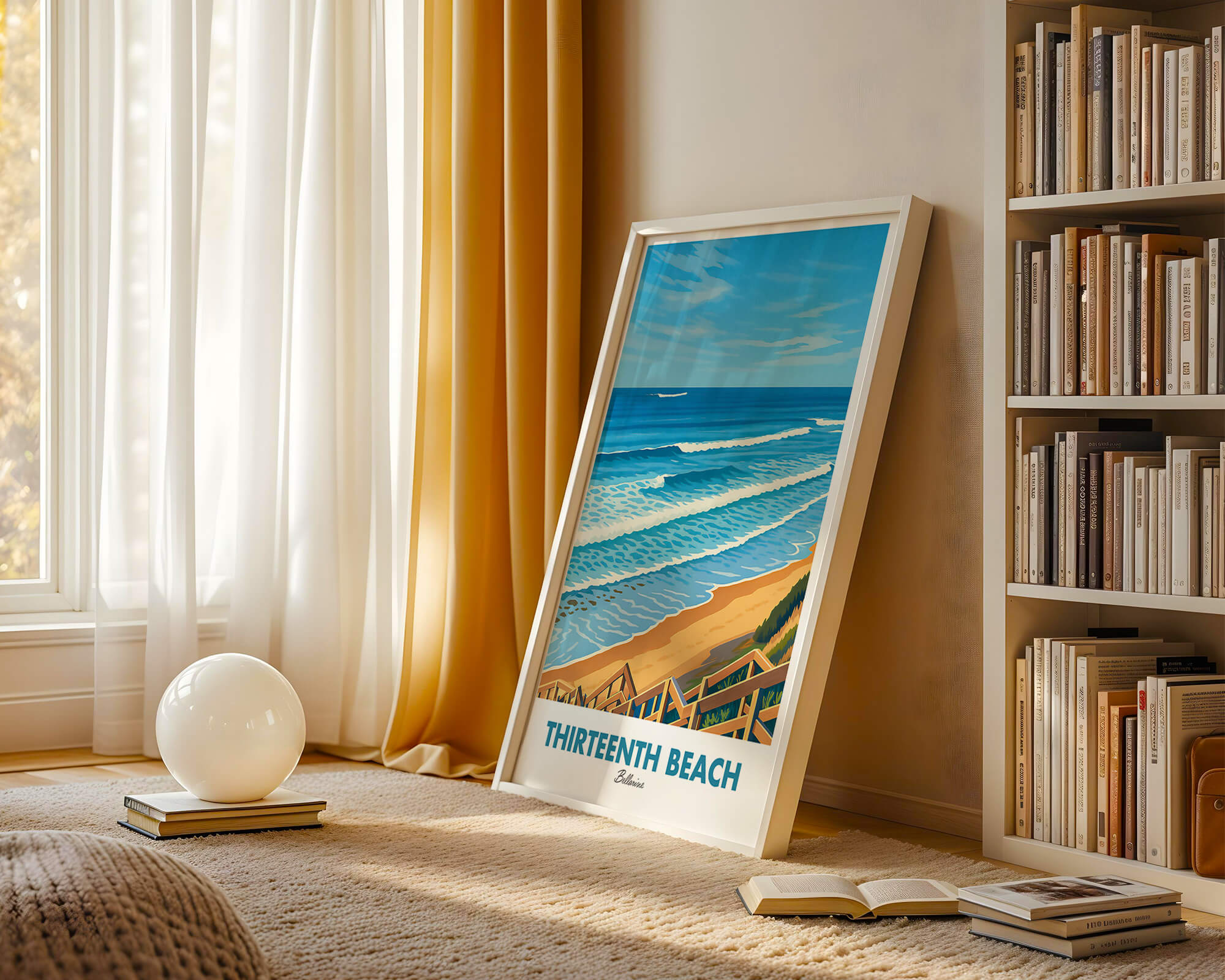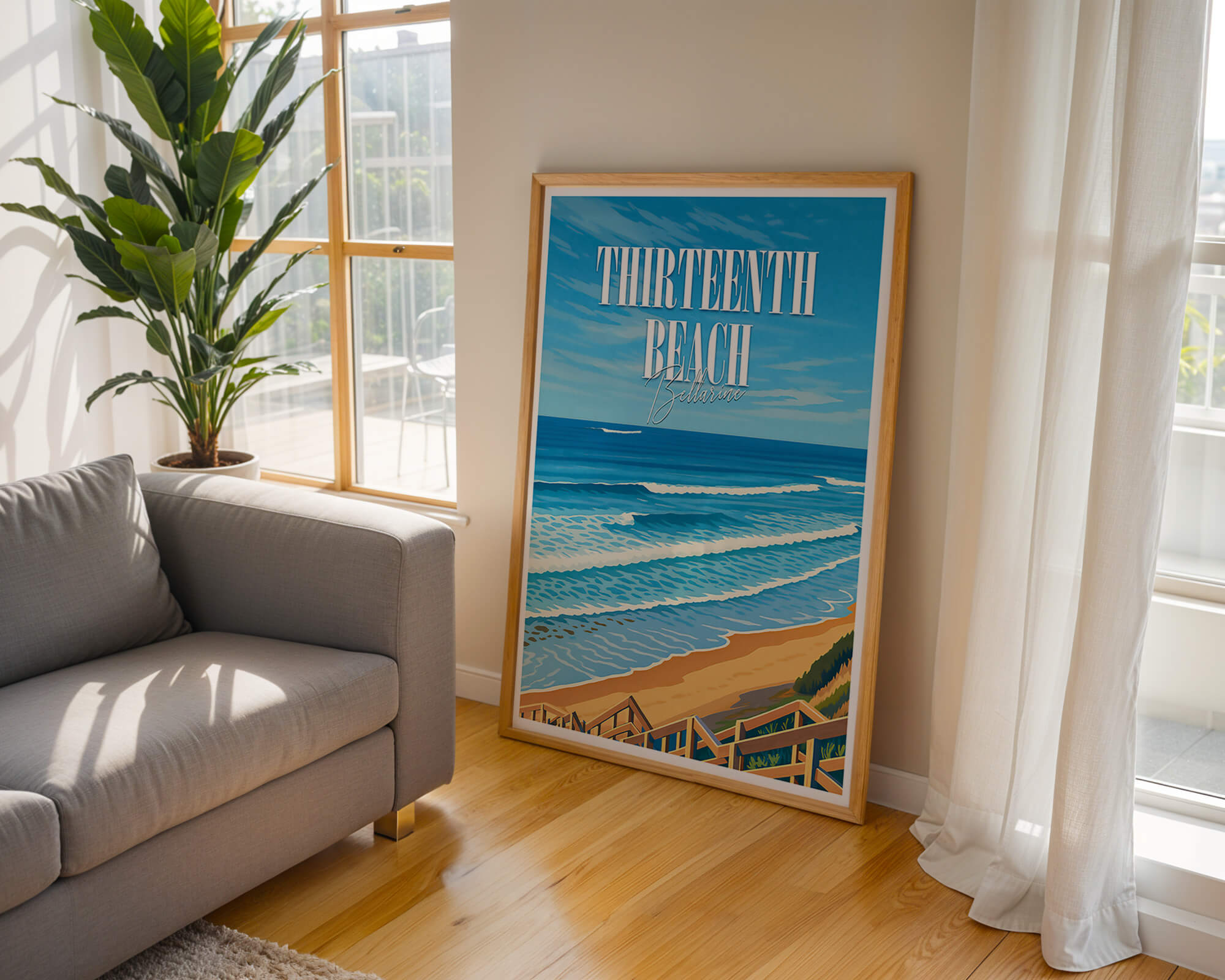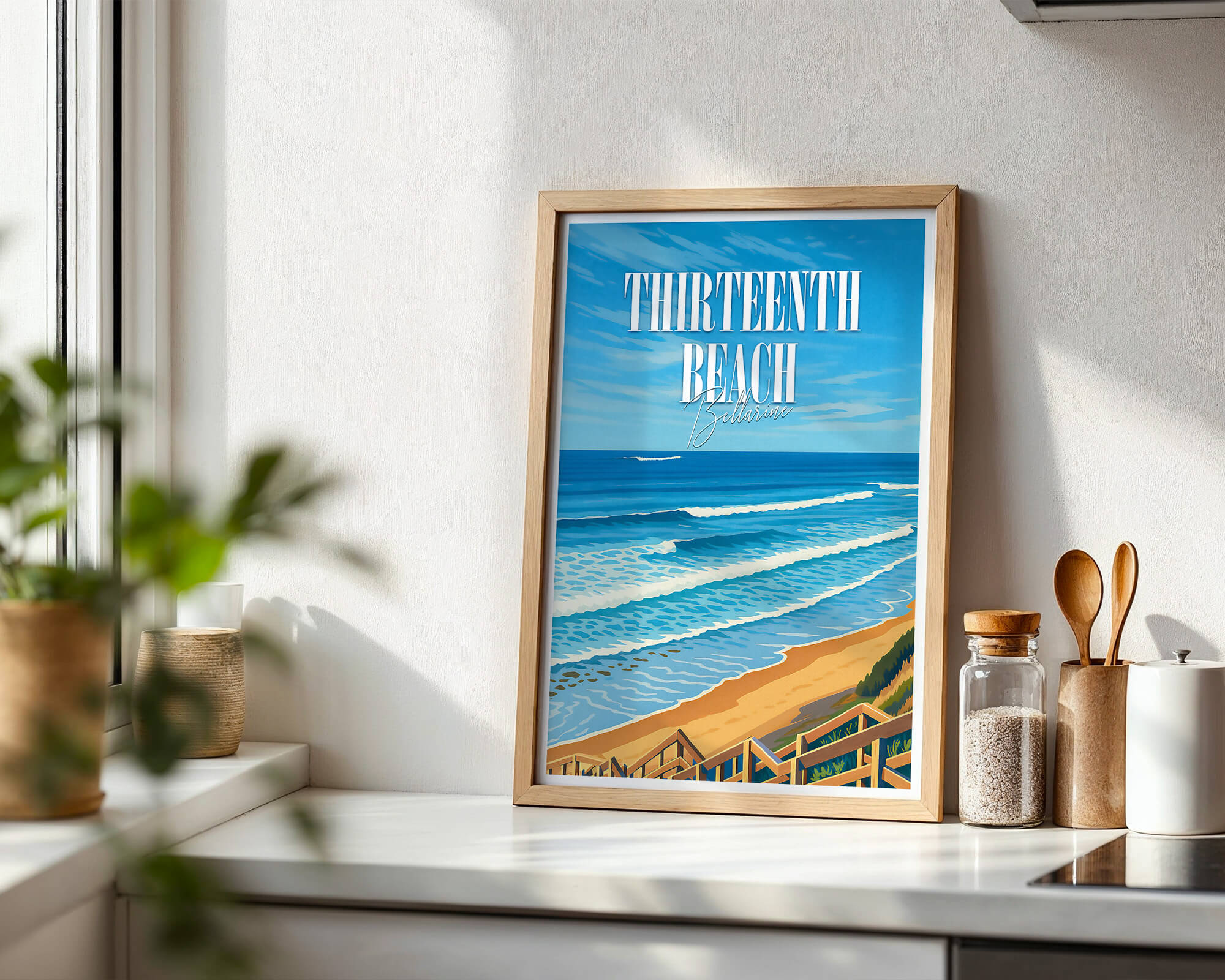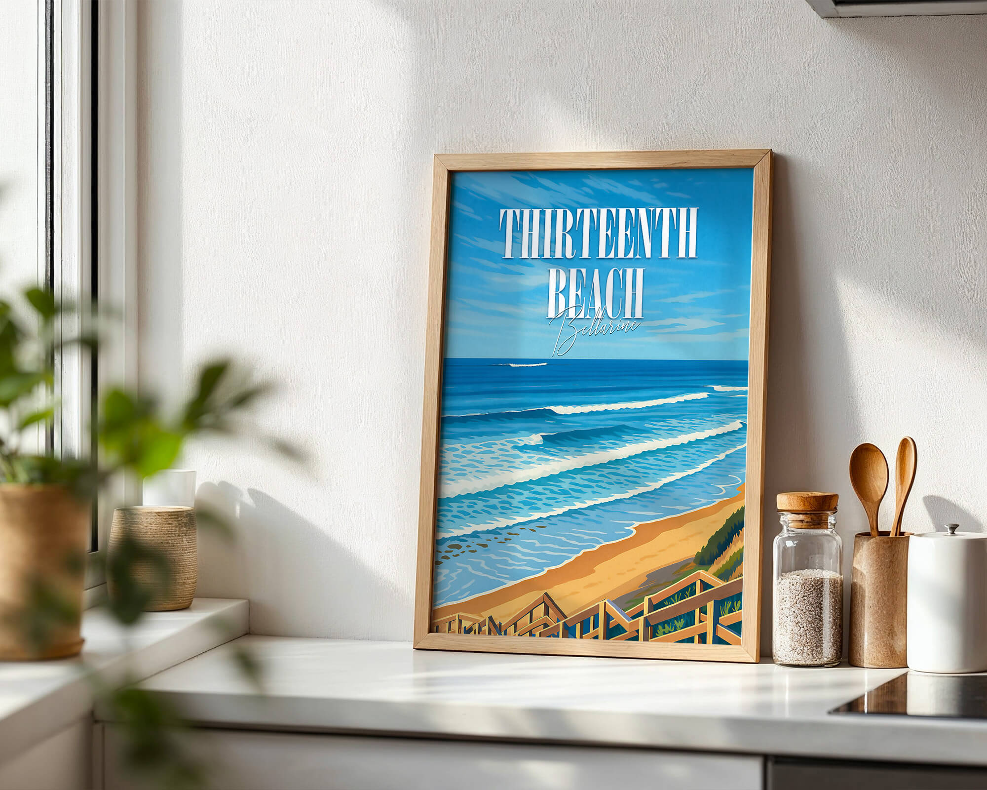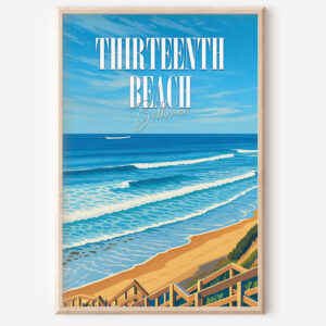 Thirteenth Beach stretches along the dunes from Barwon Heads, serving up banks, reef patches and brilliant sunsets. Our retro poster captures the boardwalks, coastal scrub and steady lines. Printed on 250 gsm archival matte paper with long-life pigment inks. Designed locally on the Bellarine and printed in Australia. Available A4 to A0 and ready to frame.