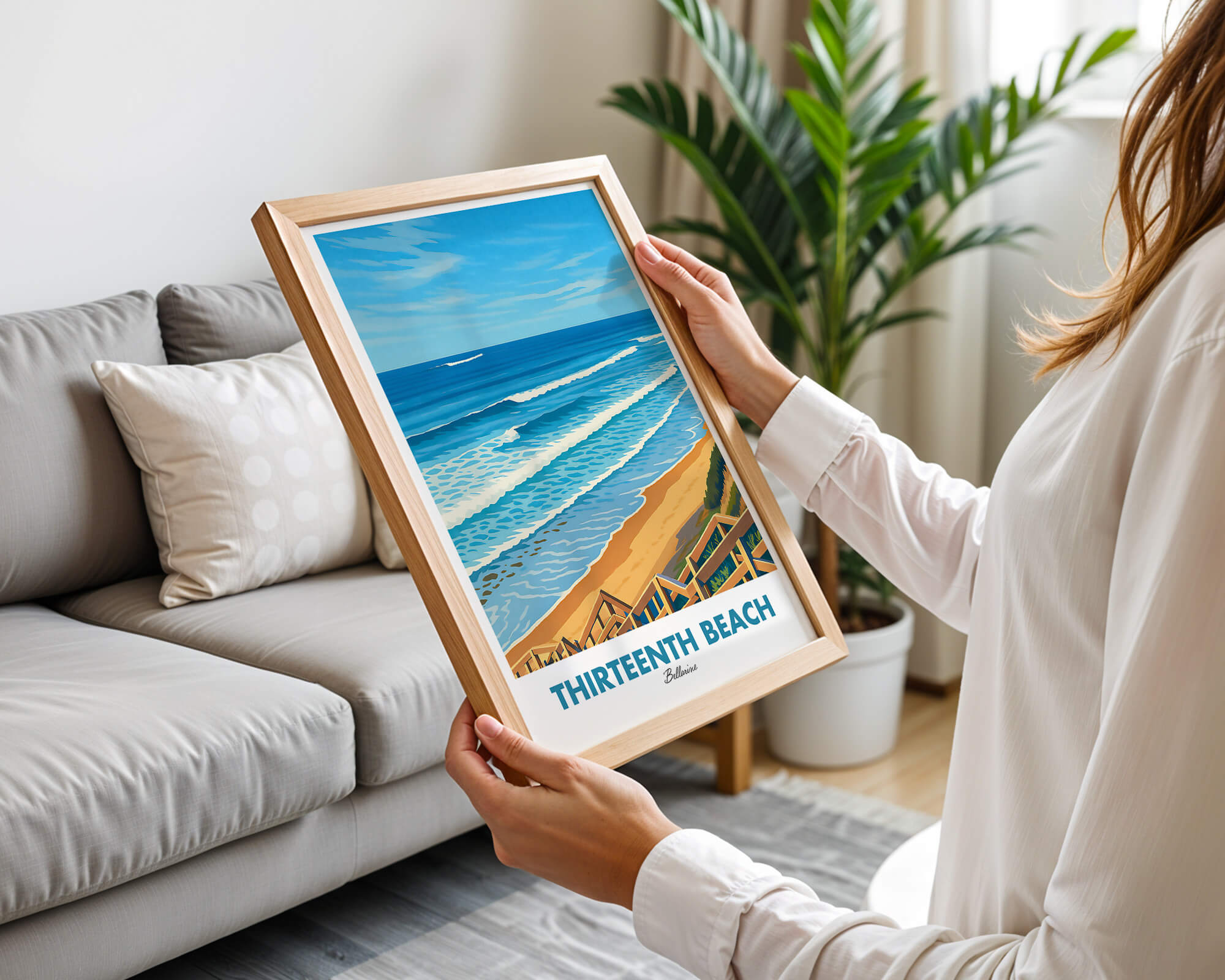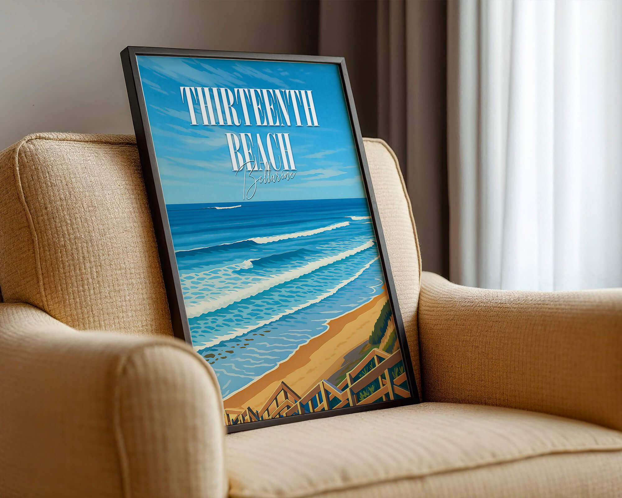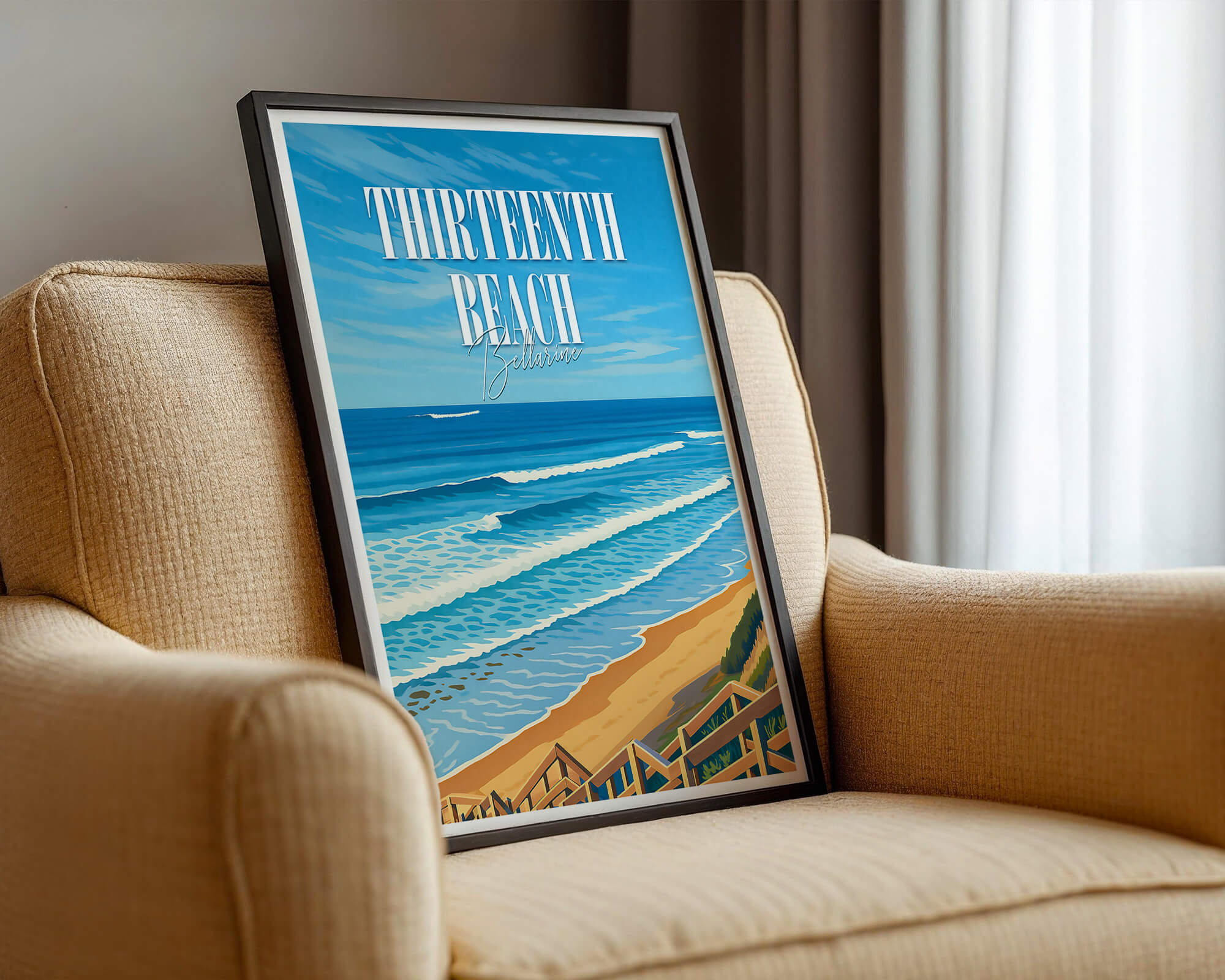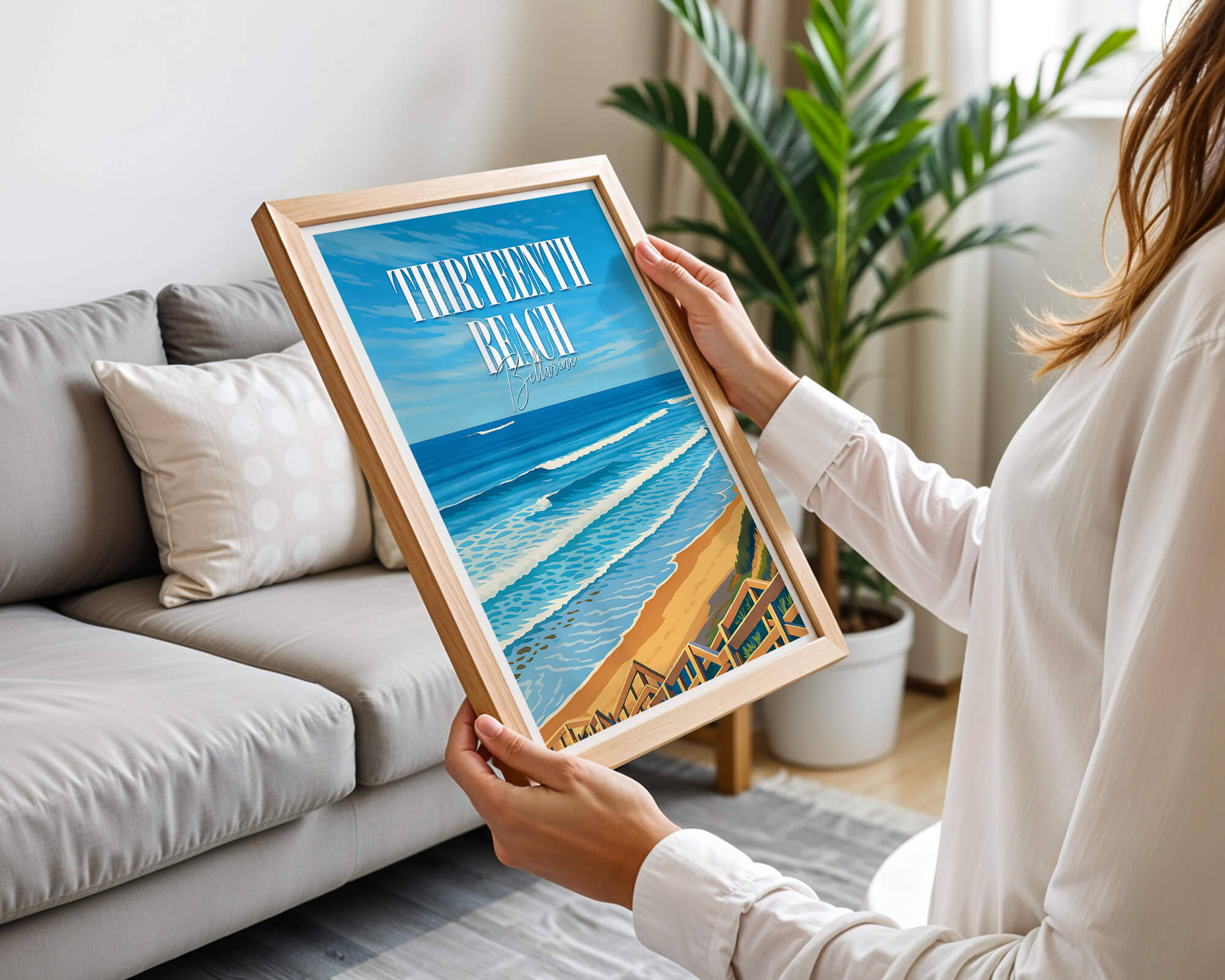 Thirteenth Beach stretches along the dunes from Barwon Heads, serving up banks, reef patches and brilliant sunsets. Our retro poster captures the boardwalks, coastal scrub and steady lines. Printed on 250 gsm archival matte paper with long-life pigment inks. Designed locally on the Bellarine and printed in Australia. Available A4 to A0 and ready to frame.