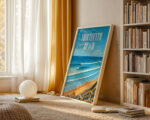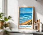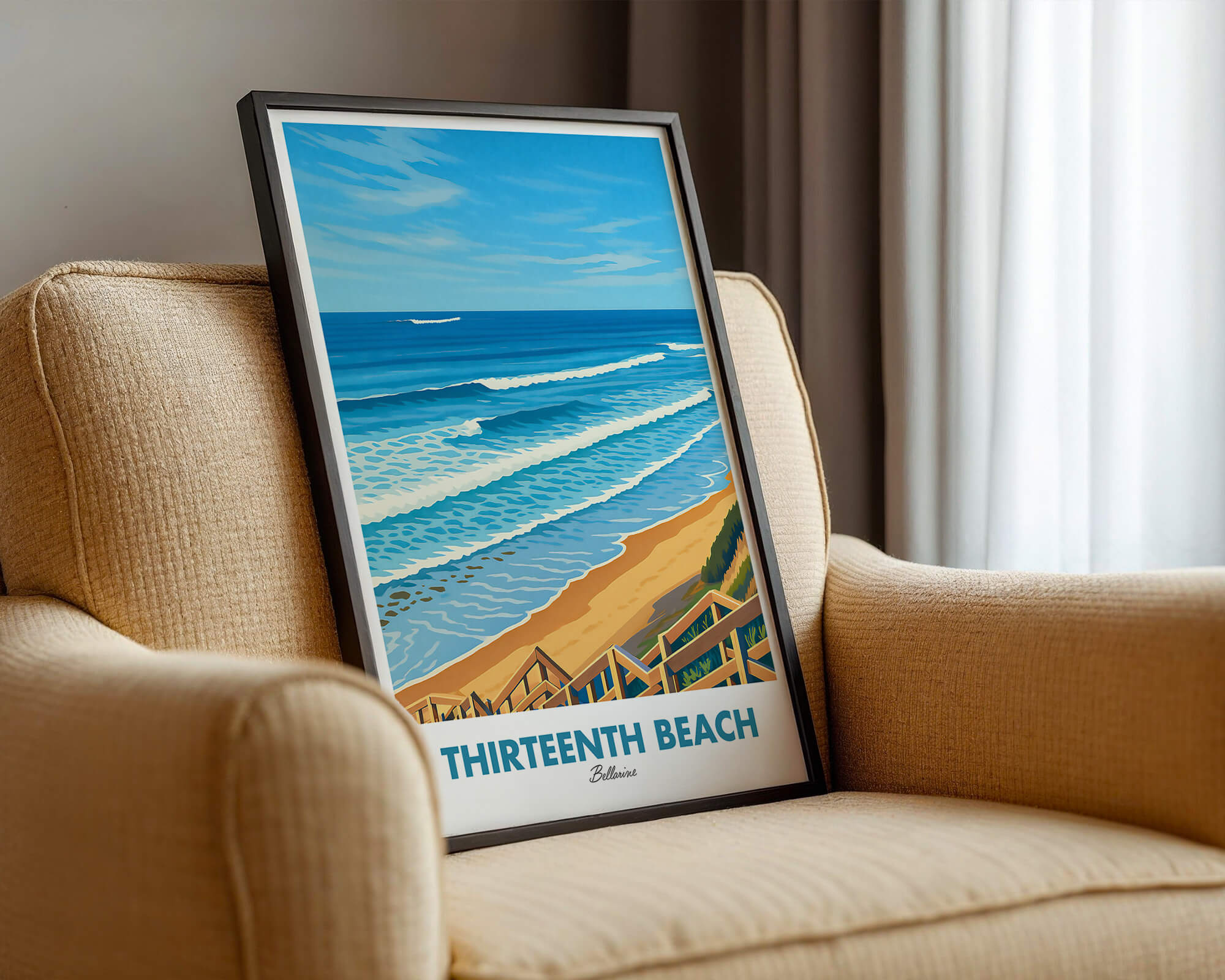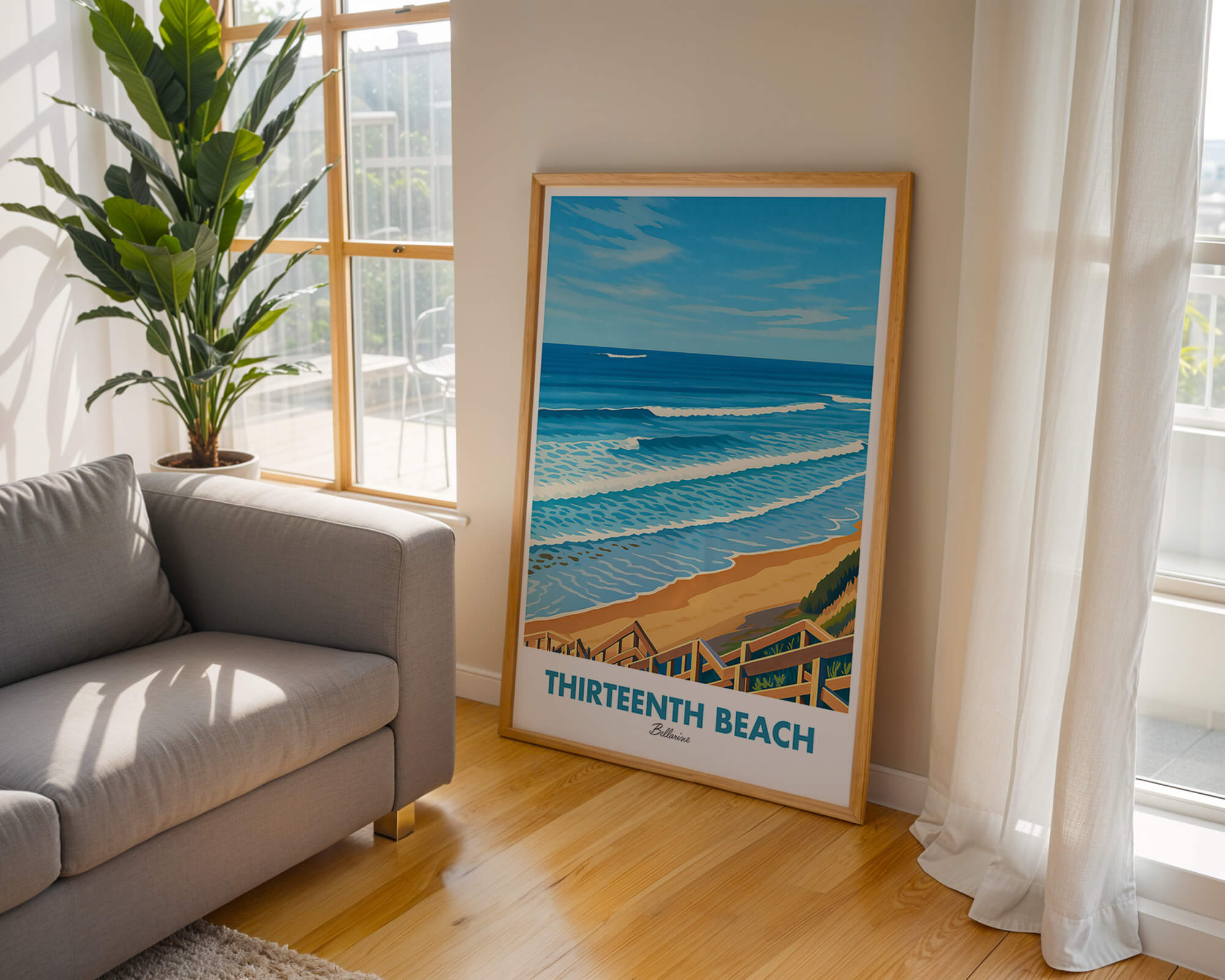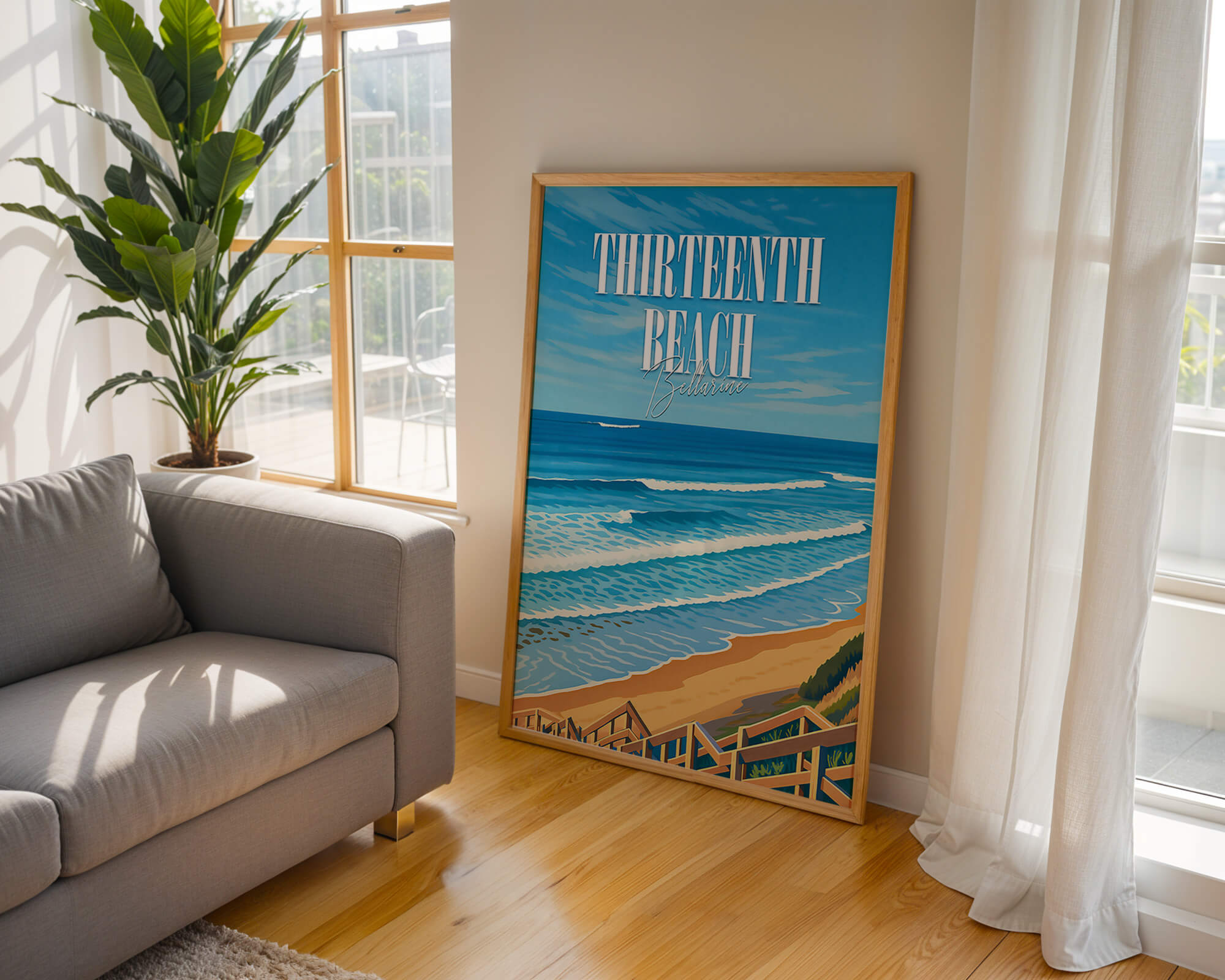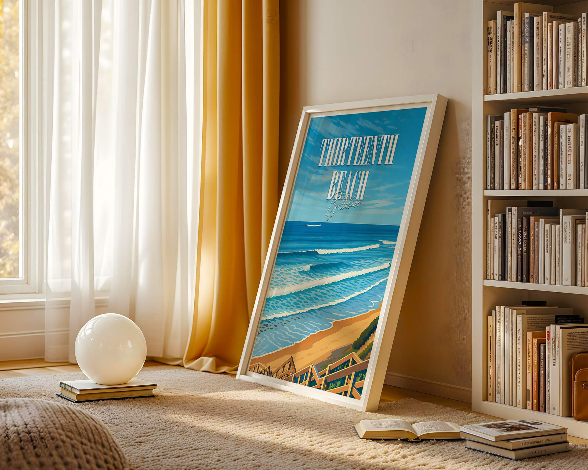 Thirteenth Beach stretches along the dunes from Barwon Heads, serving up banks, reef patches and brilliant sunsets. Our retro poster captures the boardwalks, coastal scrub and steady lines. Printed on 250 gsm archival matte paper with long-life pigment inks. Designed locally on the Bellarine and printed in Australia. Available A4 to A0 and ready to frame.