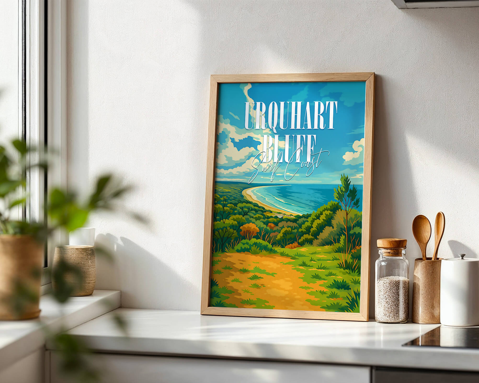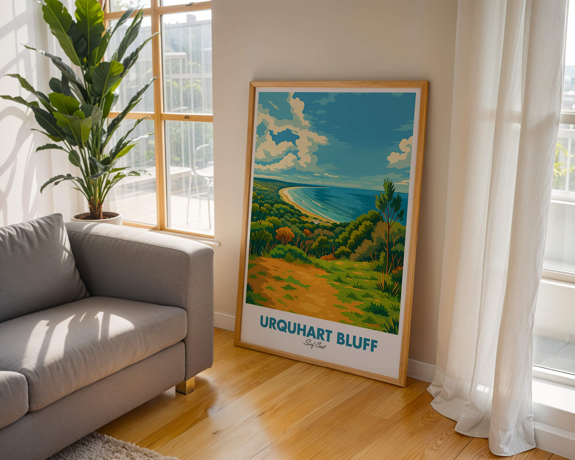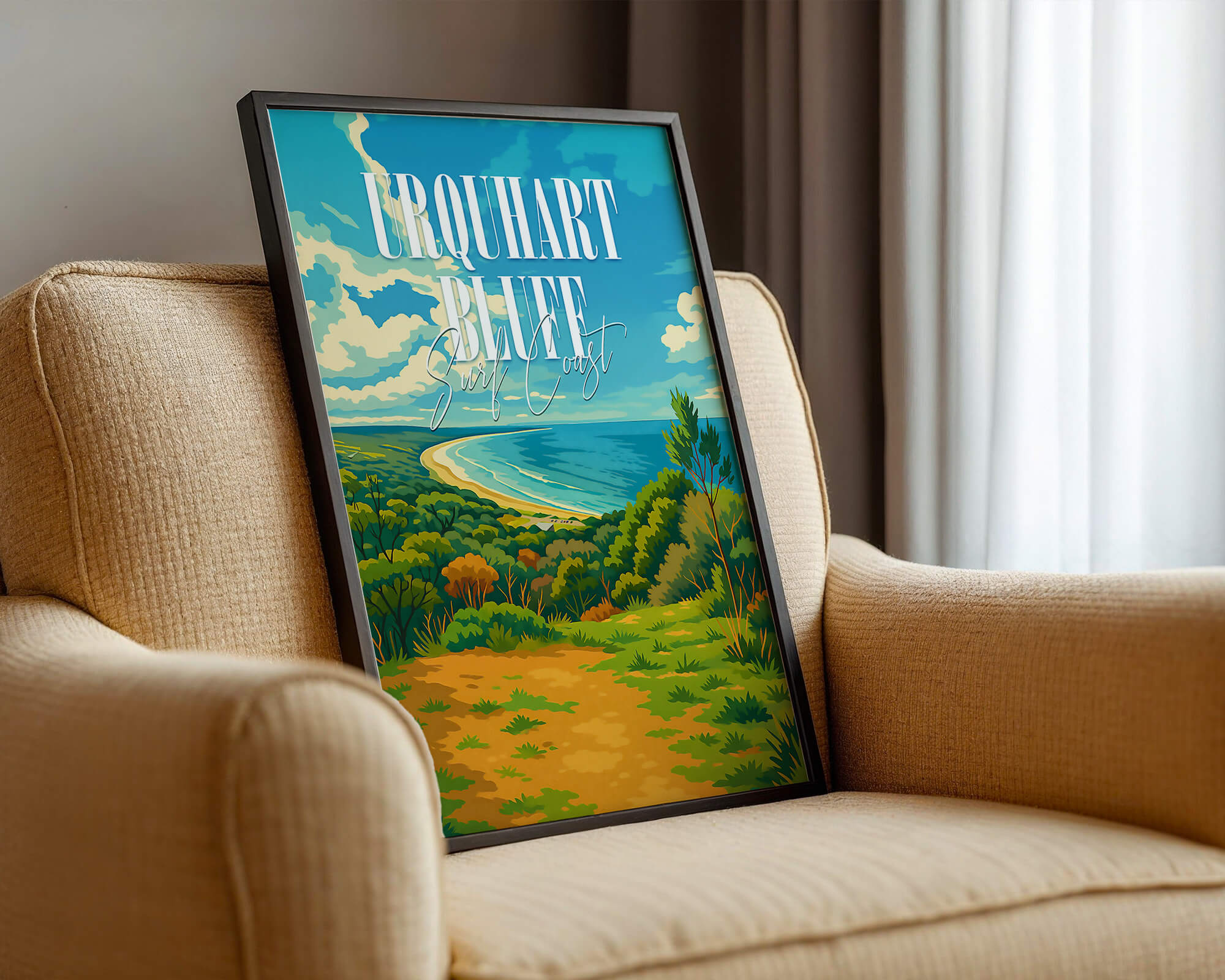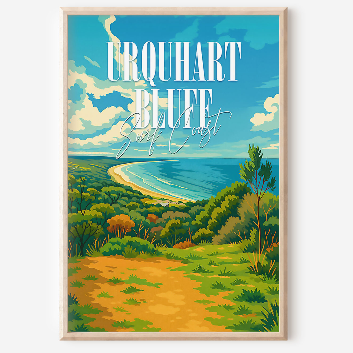 Urquhart Bluff is beloved for its headland walks, reef shelves and rolling sets. This retro travel poster captures the lookout with warm, late-afternoon light. Printed on 250 gsm matte art paper using archival pigment inks for long-lasting color. A coastal decor upgrade for living rooms, studies or beach houses. Designed locally on the Surf Coast and printed in Australia. Available in sizes A4 to A0.