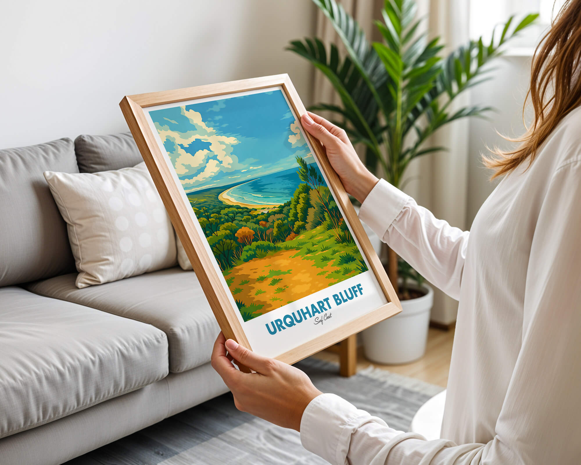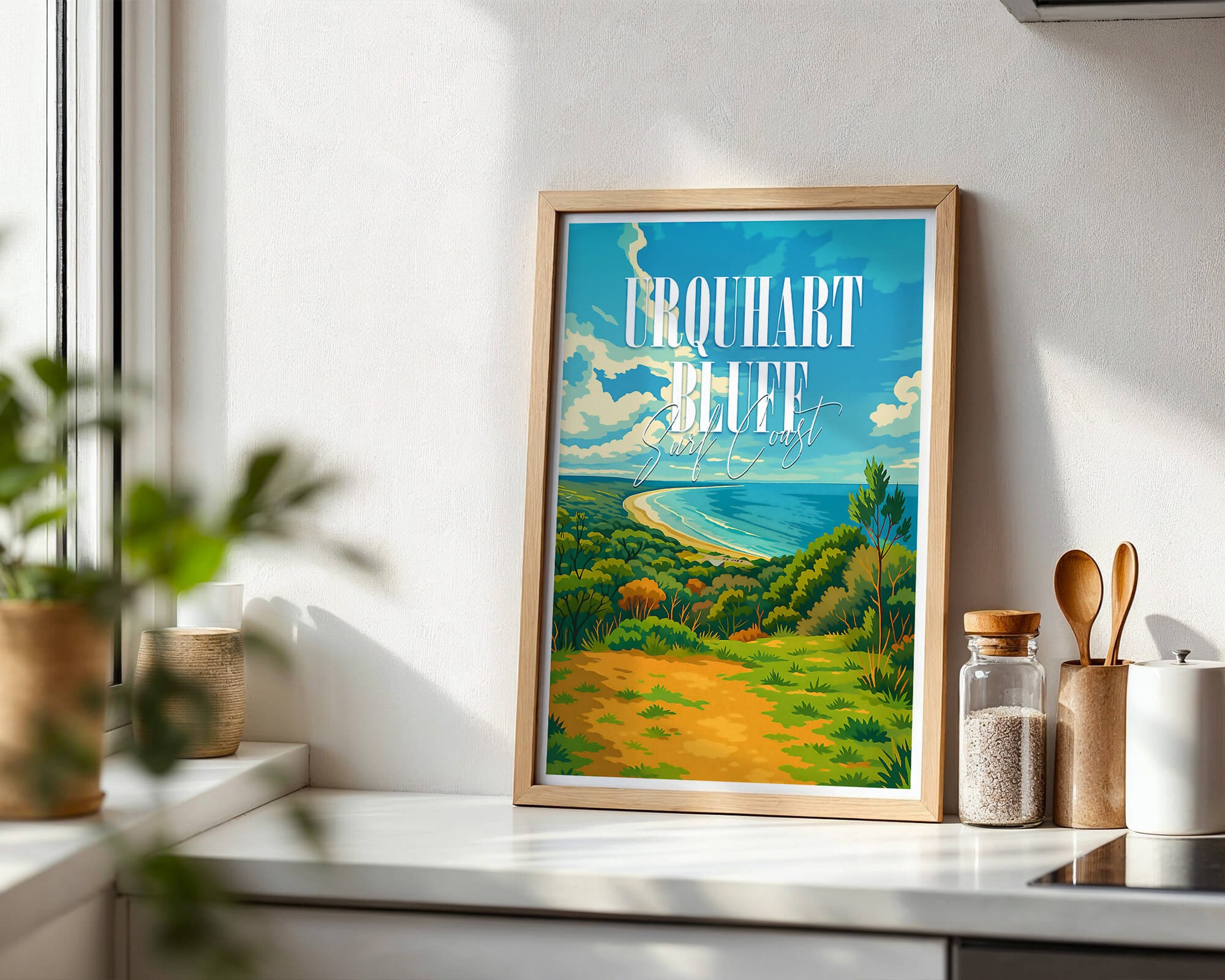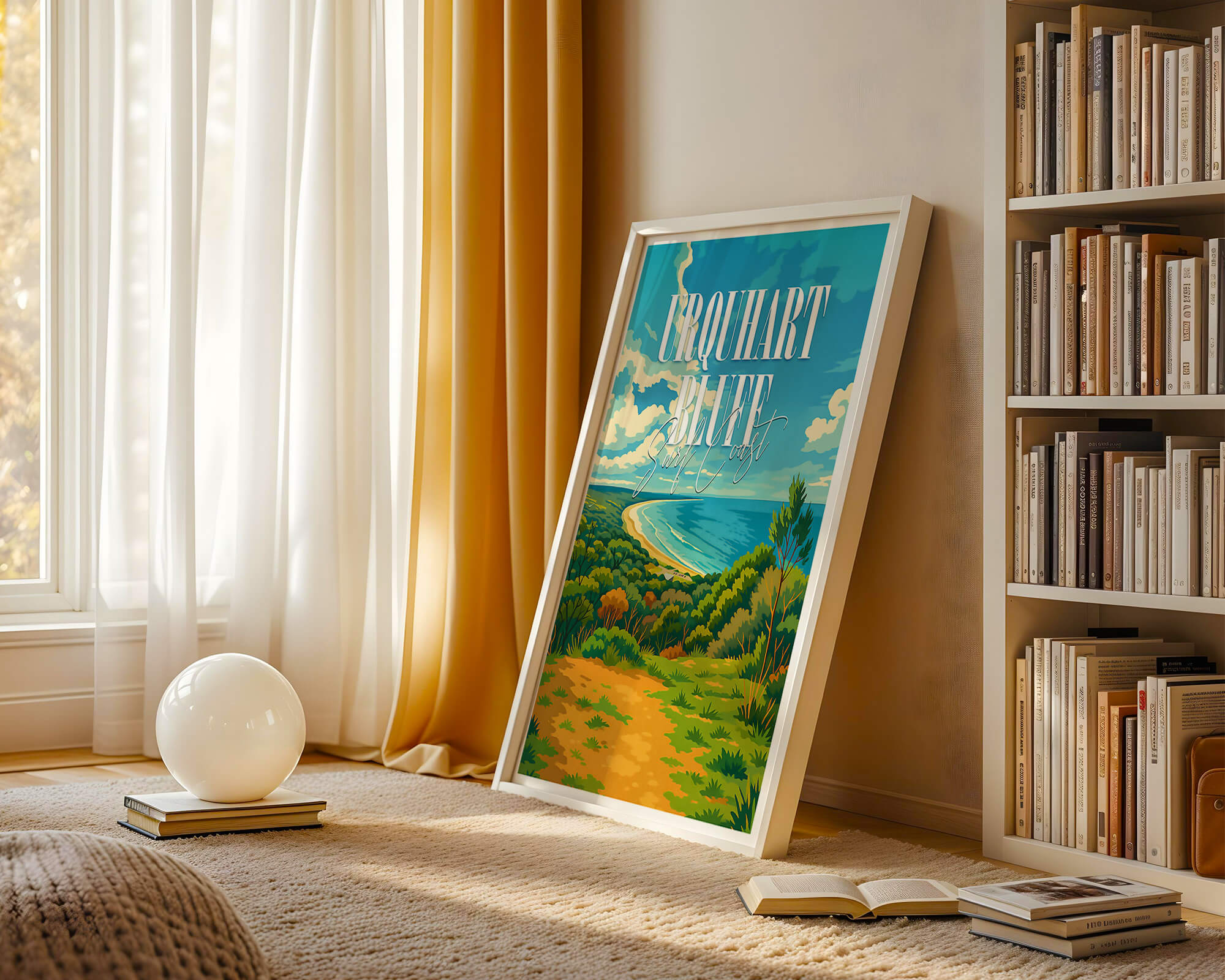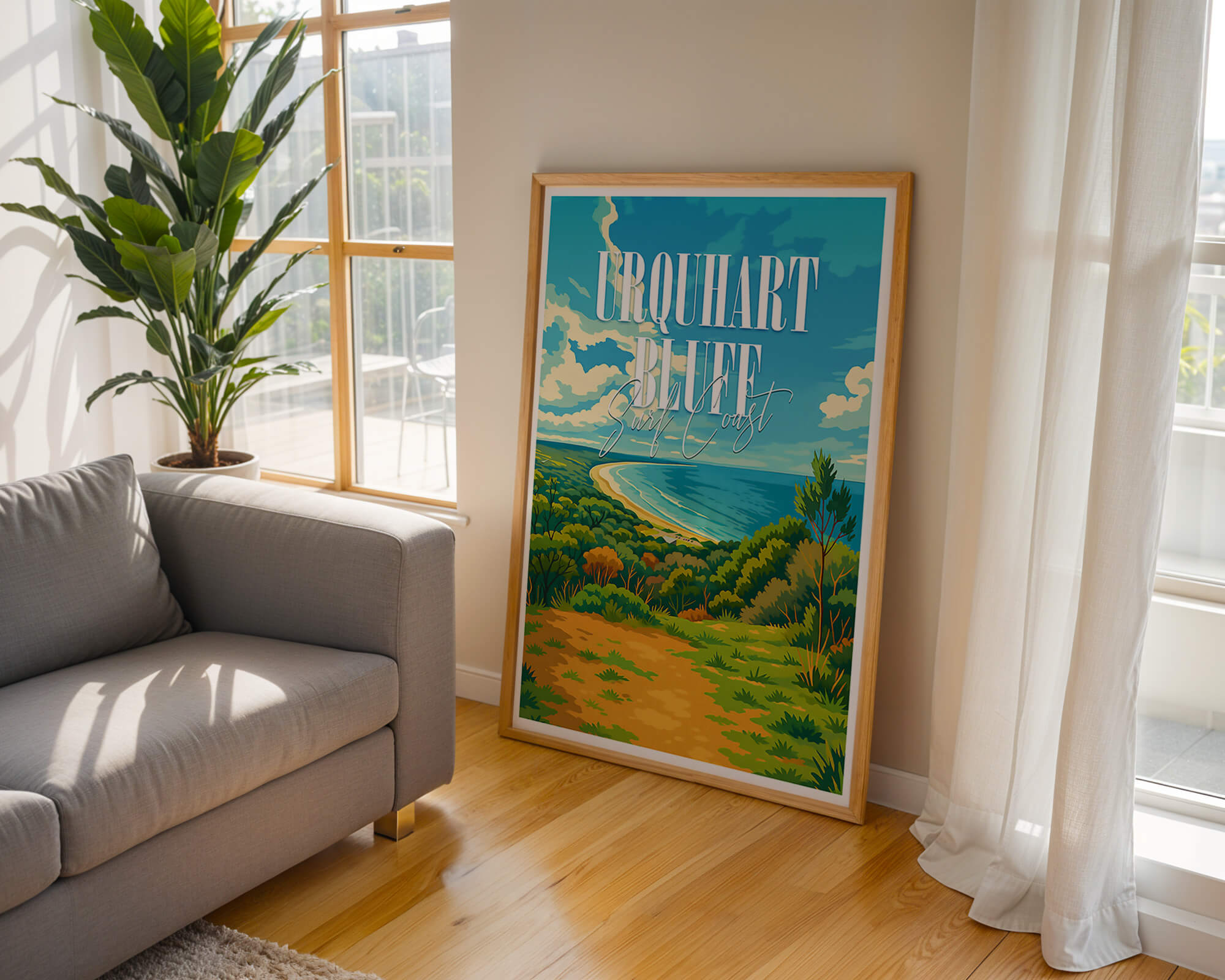 Urquhart Bluff is beloved for its headland walks, reef shelves and rolling sets. This retro travel poster captures the lookout with warm, late-afternoon light. Printed on 250 gsm matte art paper using archival pigment inks for long-lasting color. A coastal decor upgrade for living rooms, studies or beach houses. Designed locally on the Surf Coast and printed in Australia. Available in sizes A4 to A0.