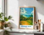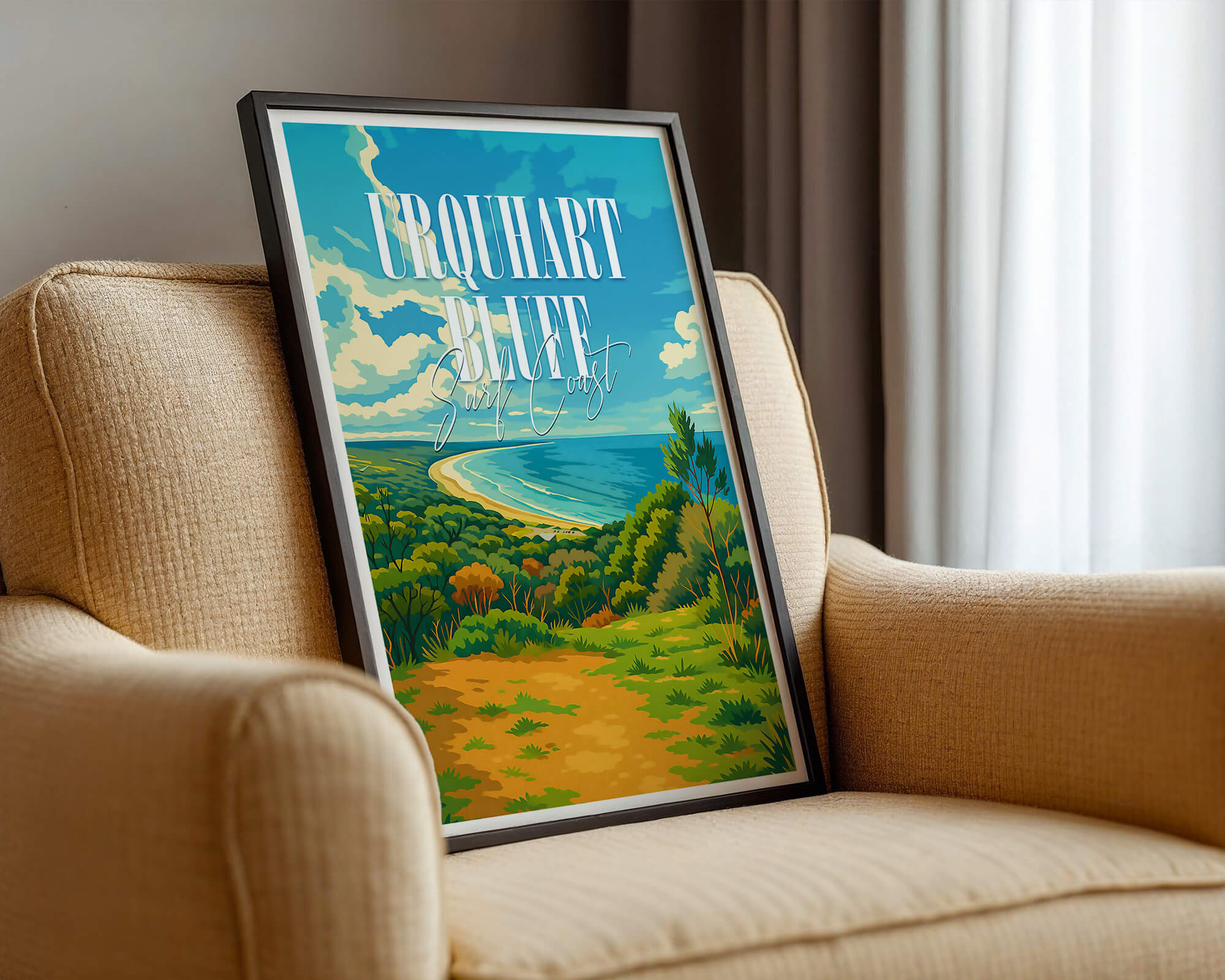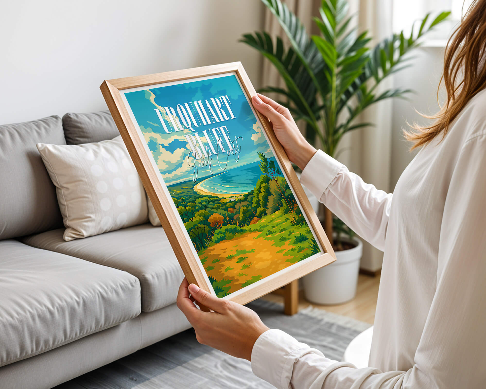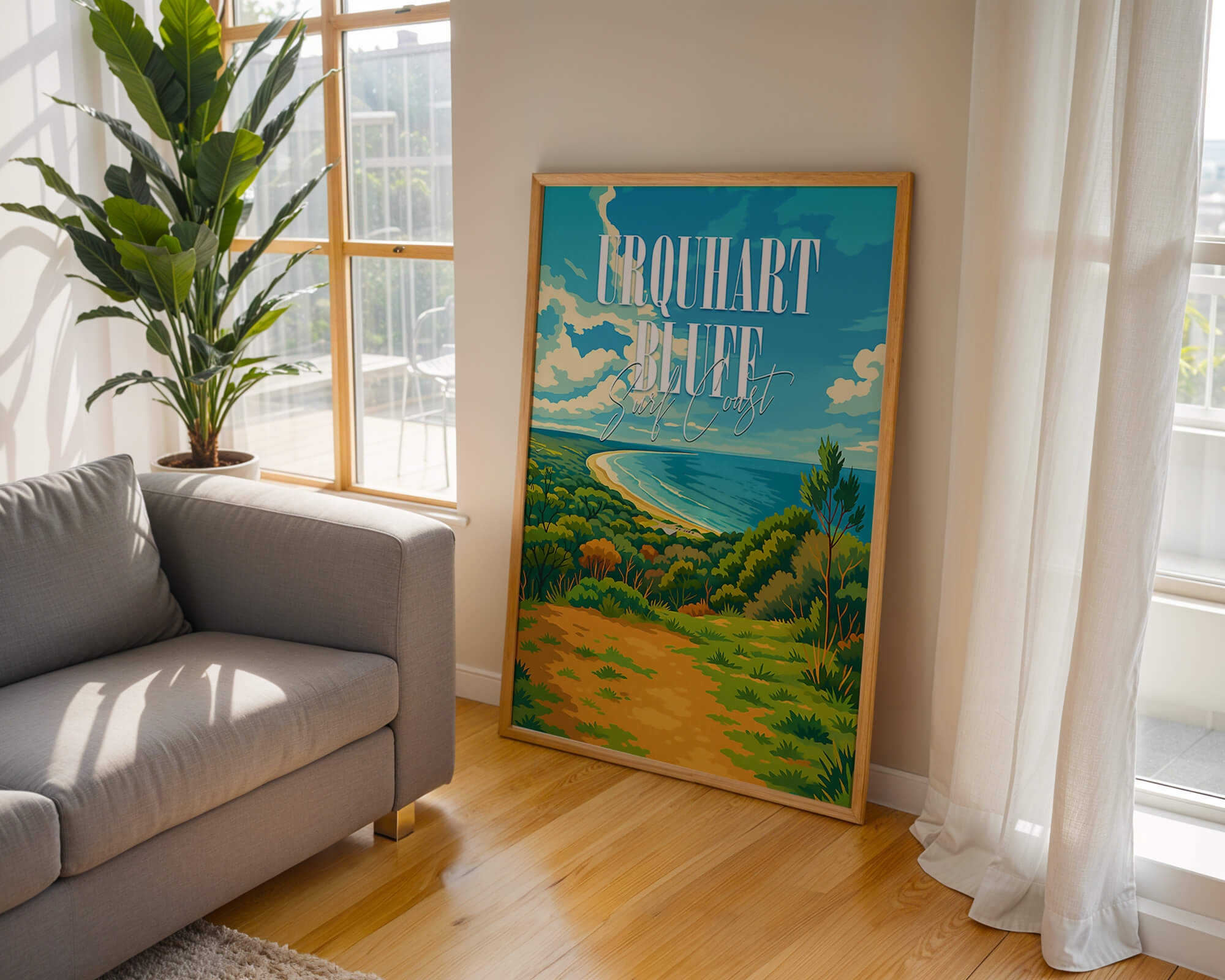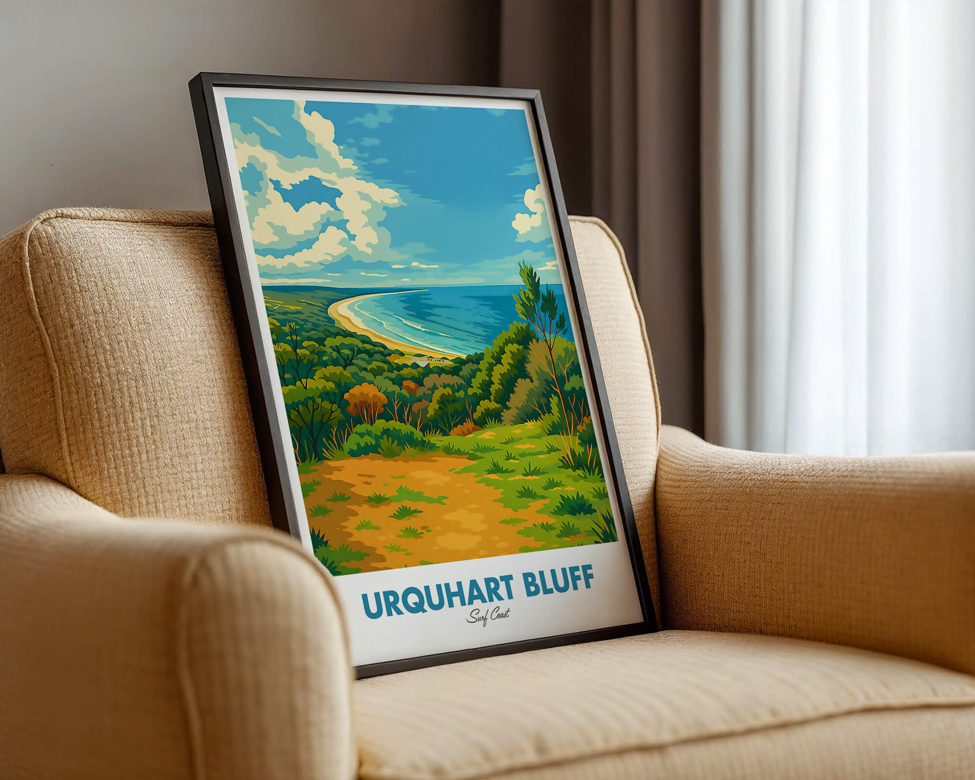 Urquhart Bluff is beloved for its headland walks, reef shelves and rolling sets. This retro travel poster captures the lookout with warm, late-afternoon light. Printed on 250 gsm matte art paper using archival pigment inks for long-lasting color. A coastal decor upgrade for living rooms, studies or beach houses. Designed locally on the Surf Coast and printed in Australia. Available in sizes A4 to A0.