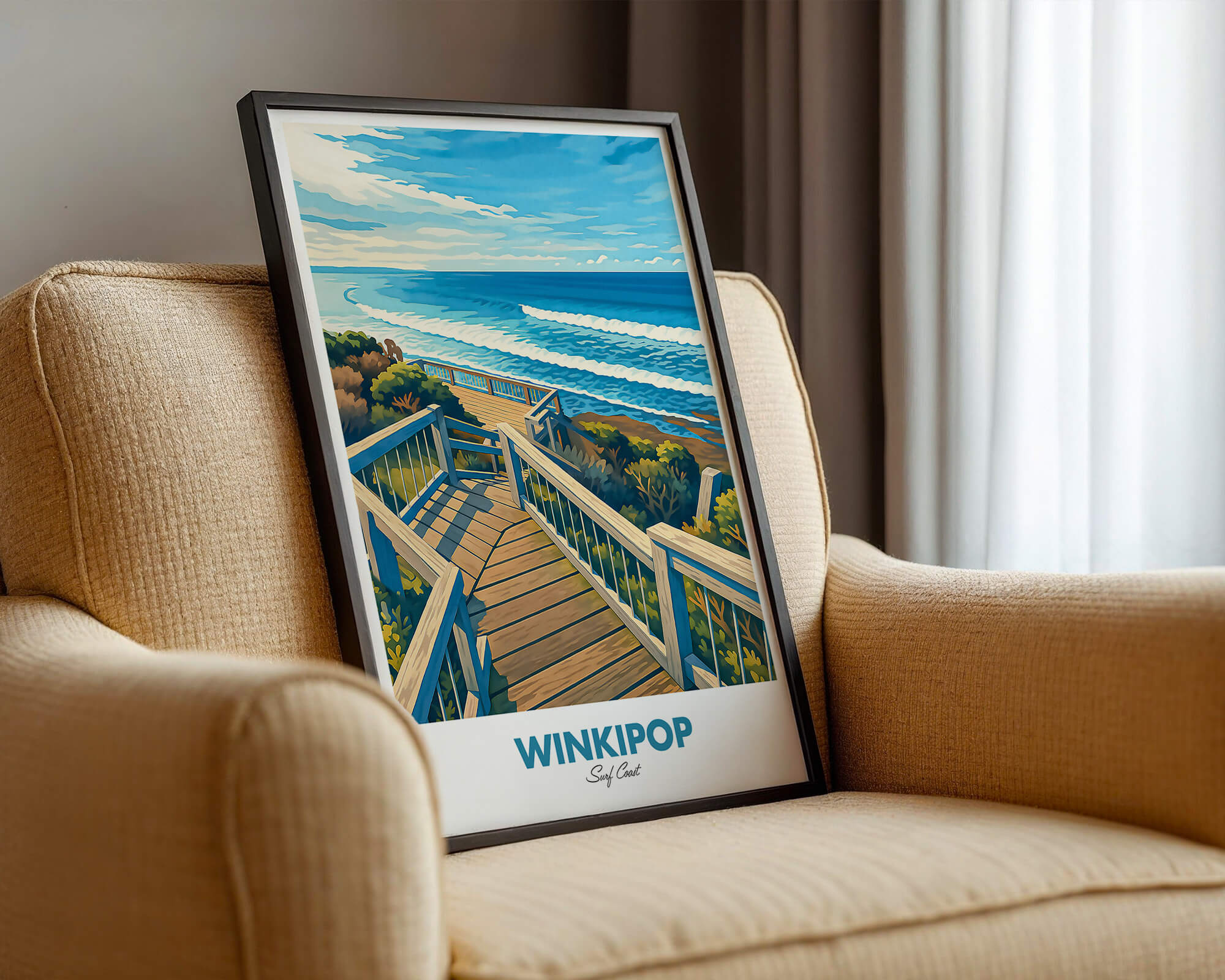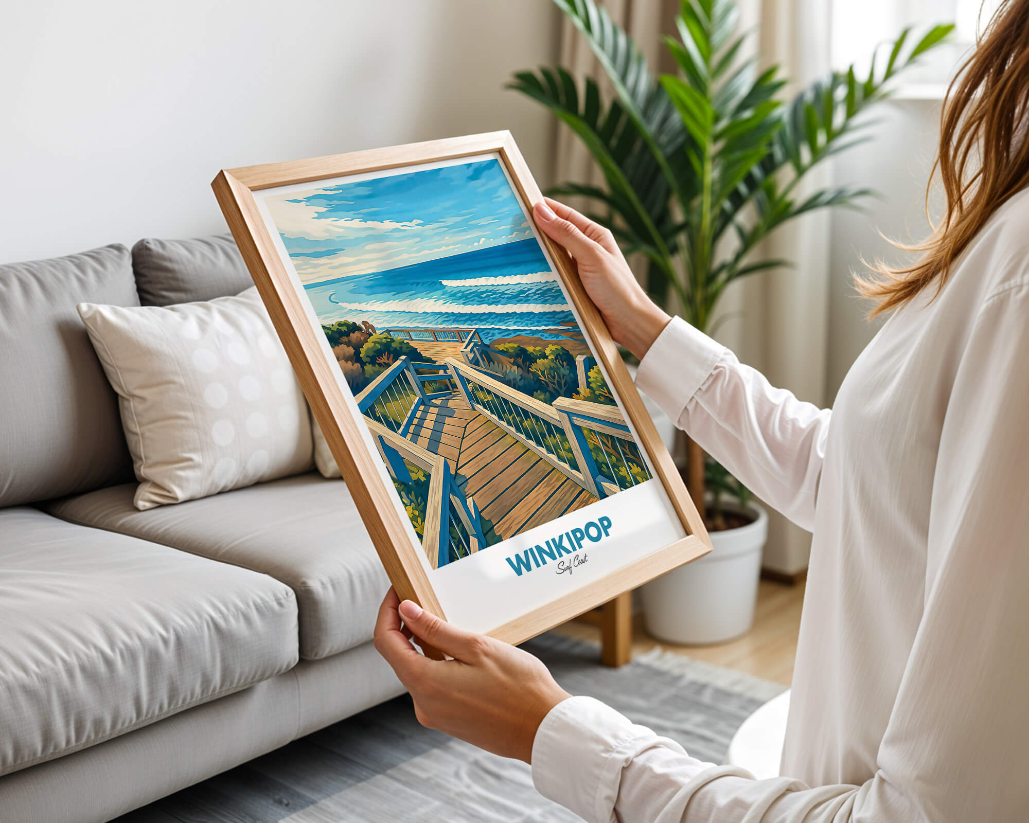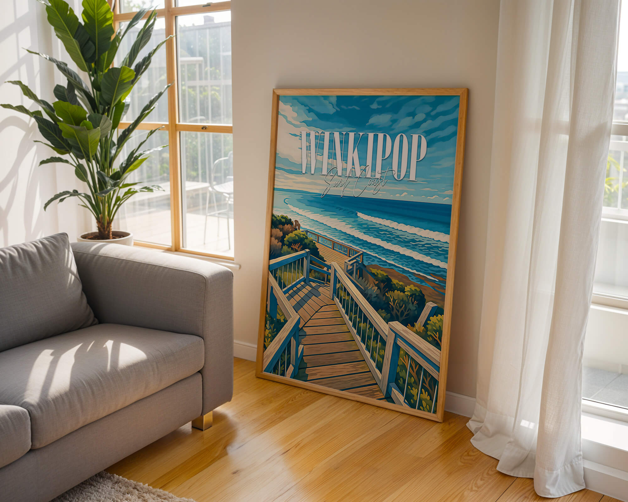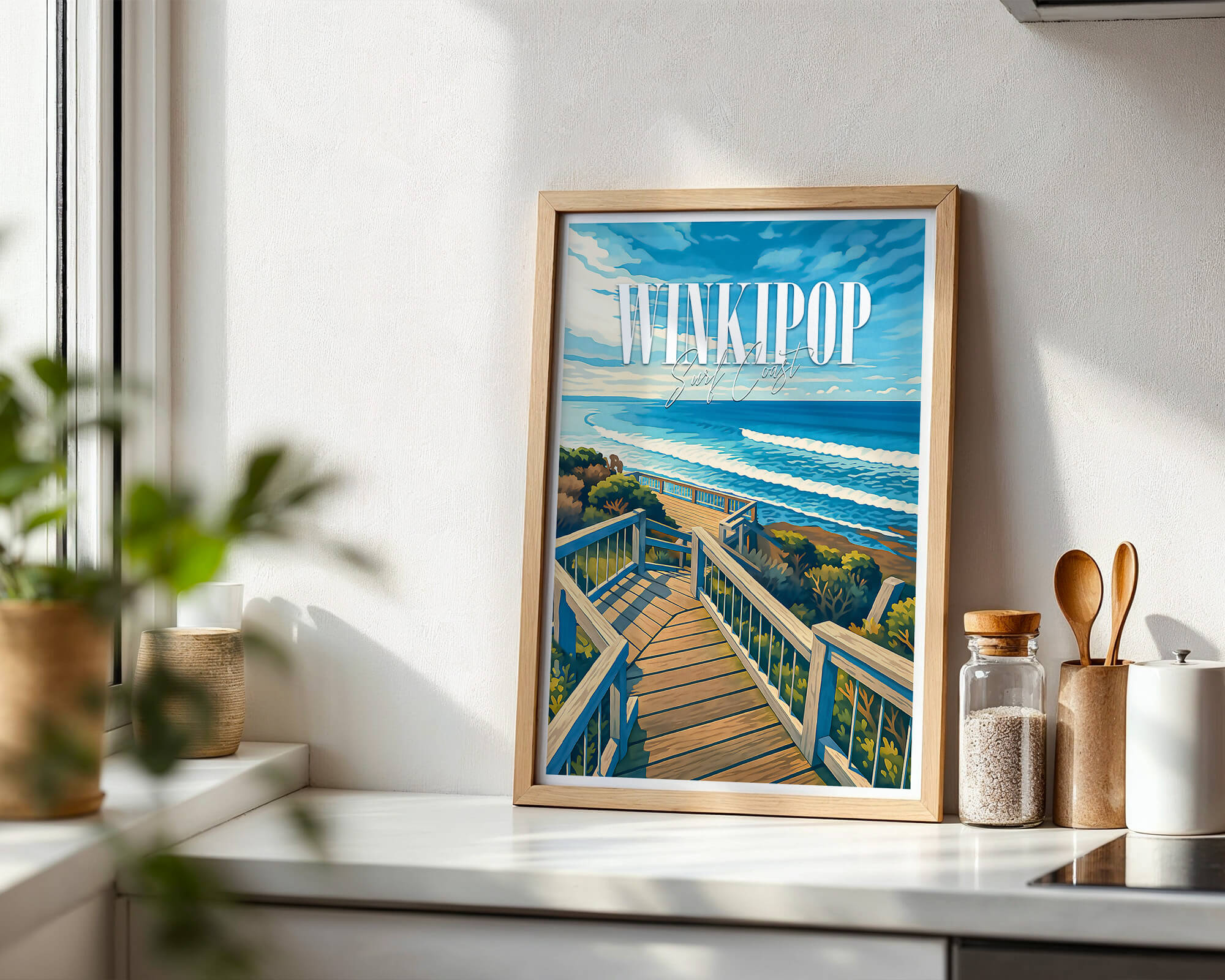 Our Winkipop retro travel poster focuses on the famous cliff-top boardwalk and the long walled sets rolling across the reef beside Bells. Crisp vector detail, turquoise water and warm sandstone hues capture the energy of the lineup from a fresh angle. Designed locally and printed in Australia on 250 gsm archival matte paper with pigment inks for longevity. Unframed.