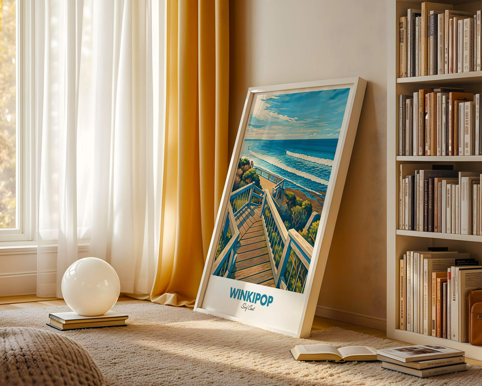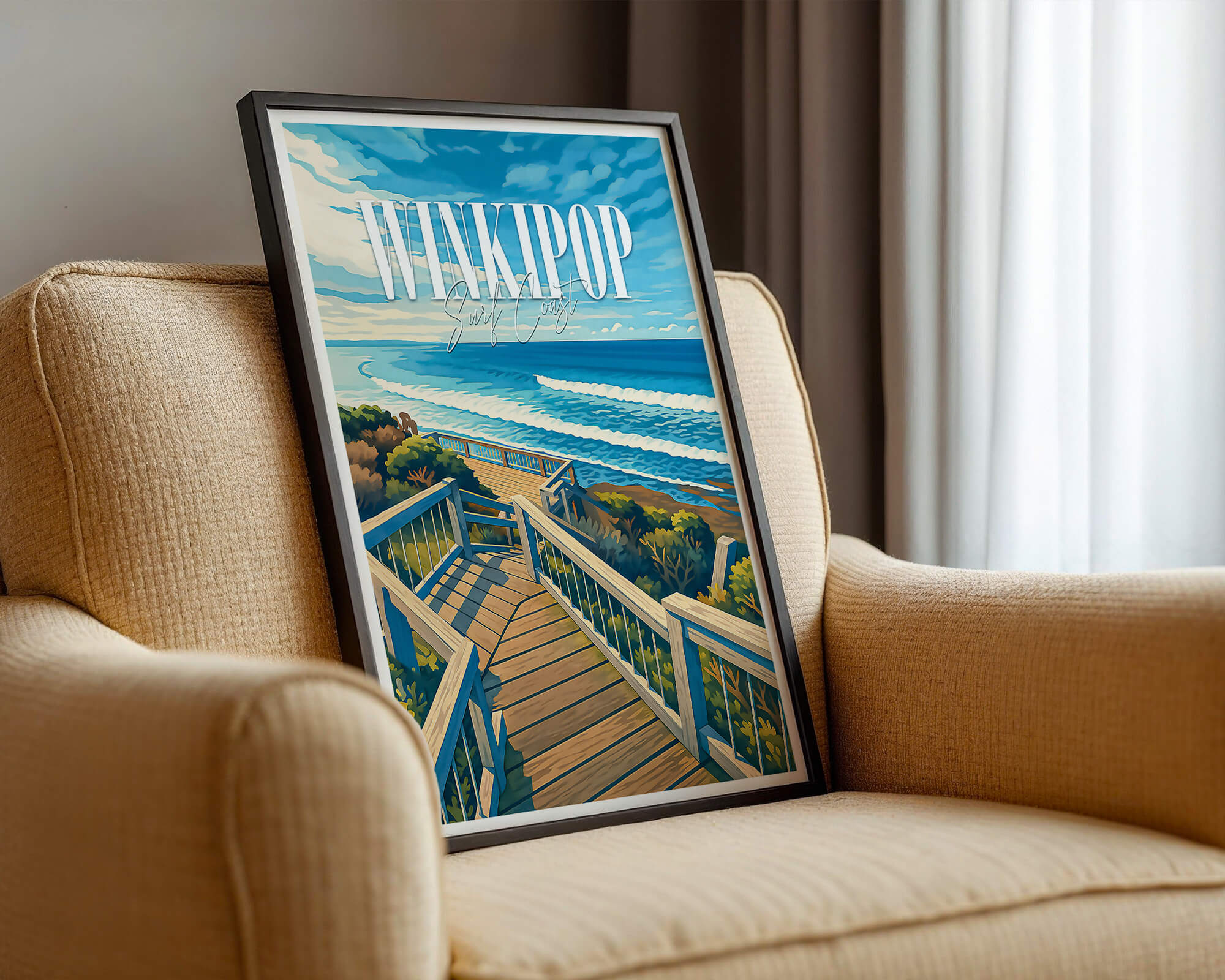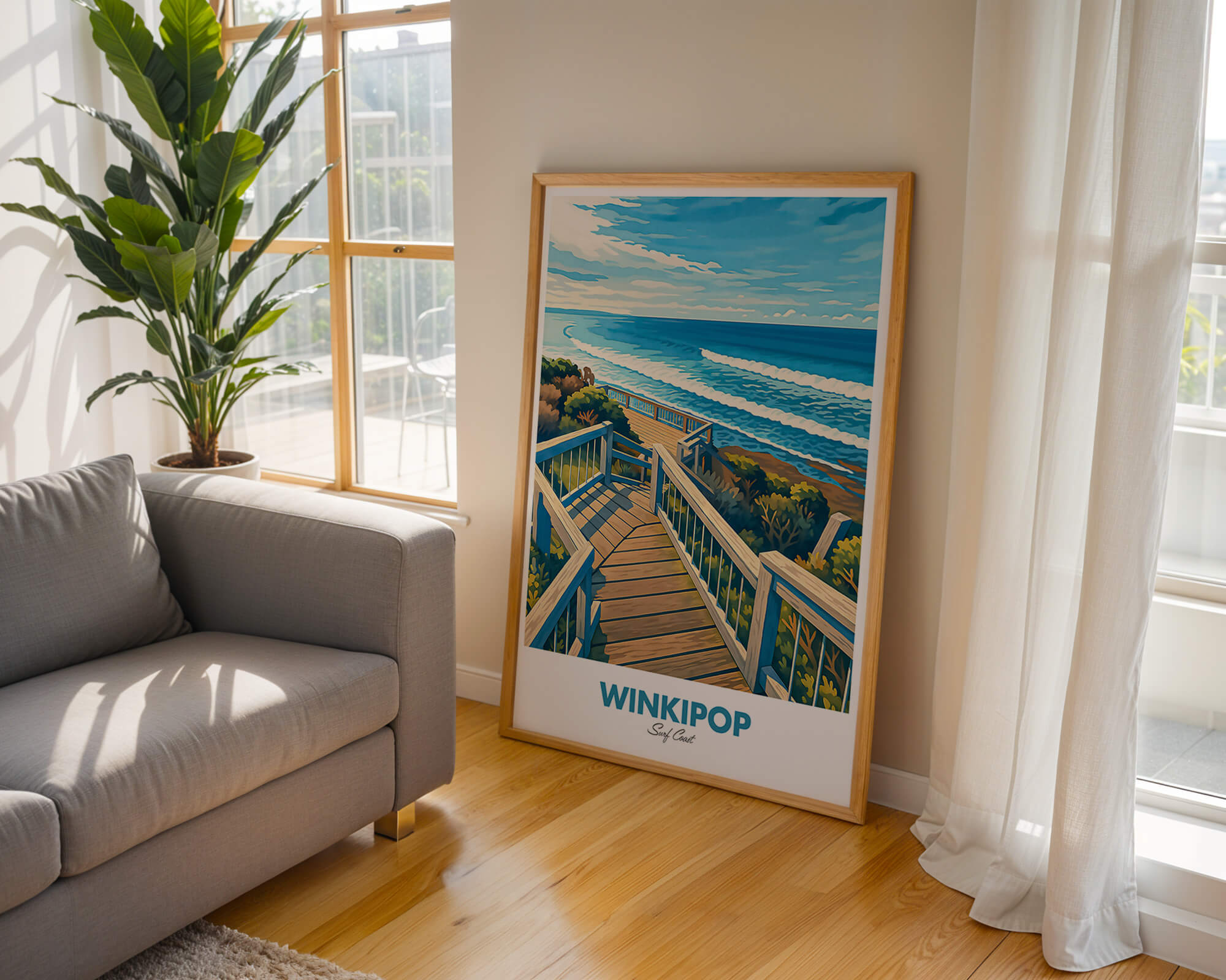 Our Winkipop retro travel poster focuses on the famous cliff-top boardwalk and the long walled sets rolling across the reef beside Bells. Crisp vector detail, turquoise water and warm sandstone hues capture the energy of the lineup from a fresh angle. Designed locally and printed in Australia on 250 gsm archival matte paper with pigment inks for longevity. Unframed.