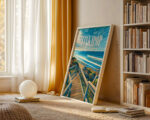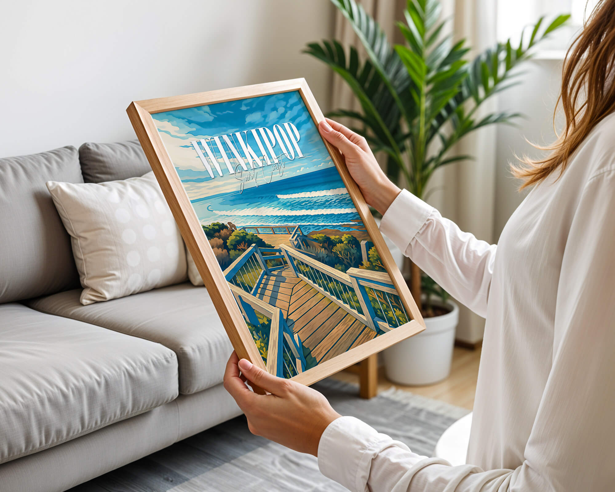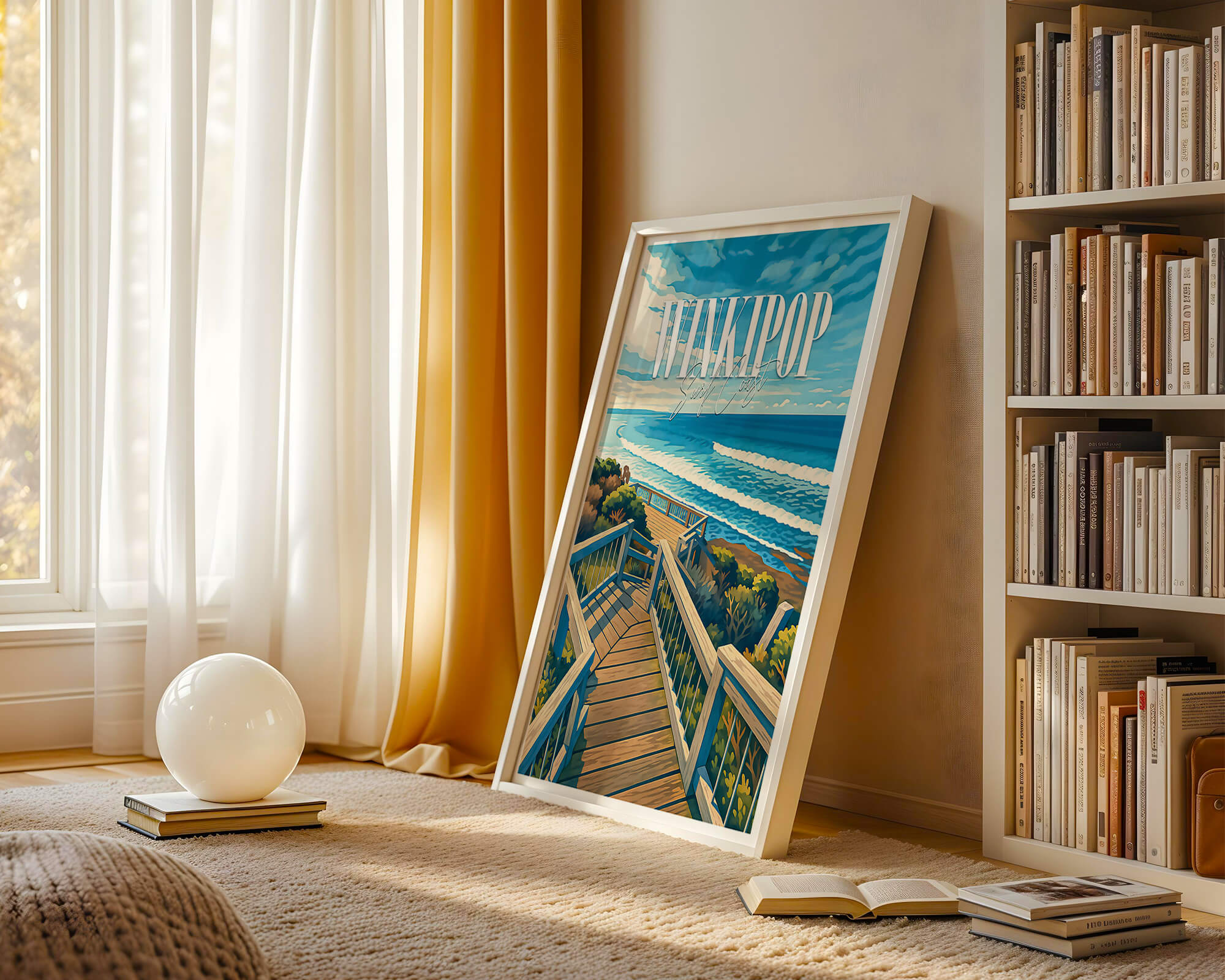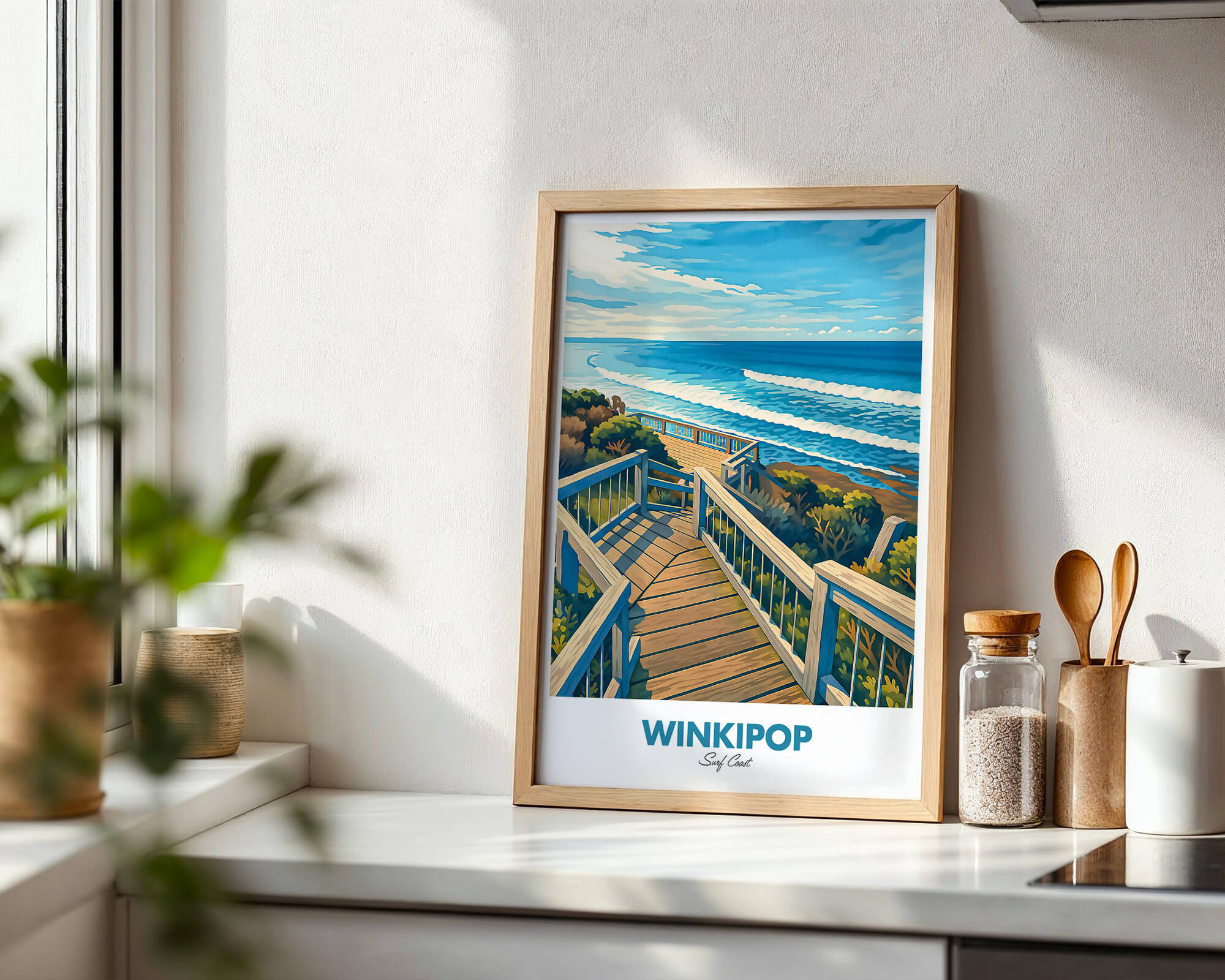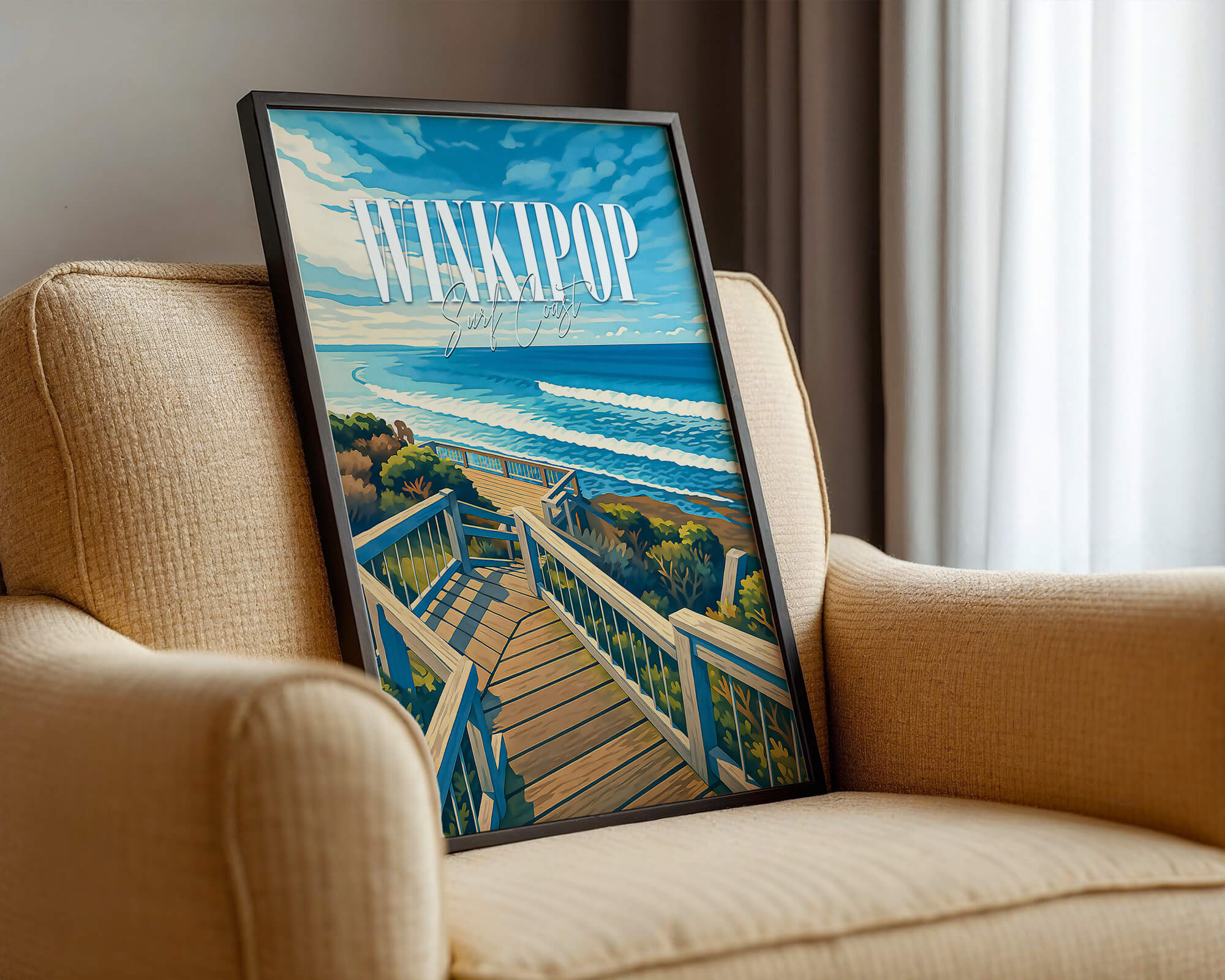 Our Winkipop retro travel poster focuses on the famous cliff-top boardwalk and the long walled sets rolling across the reef beside Bells. Crisp vector detail, turquoise water and warm sandstone hues capture the energy of the lineup from a fresh angle. Designed locally and printed in Australia on 250 gsm archival matte paper with pigment inks for longevity. Unframed.